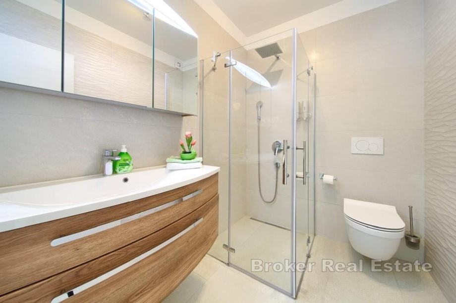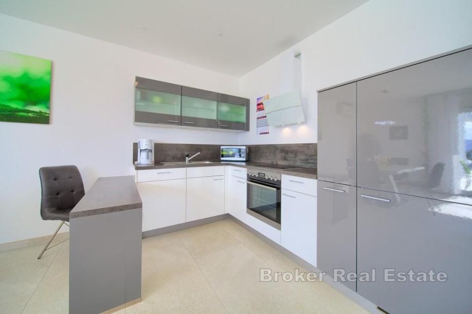 Apartmani su potpuno opremljeni modernim namještajem i spremni za korištenje. Objekt je građen kvalitetnim materijalima, opremljen modernim sanitarijama, klimatizacijom u svim apartmanima, a jedan apartman ima i podno grijanje. Na krovu su solarni paneli koji smanjuju režijske troškove. Okućnica je uređena i ograđena, s lounge kutkom, ljetnom kuhinjom, roštiljem, krušnom peći, grijanim bazenom sa sunčalištem i više parkirnih mjesta.