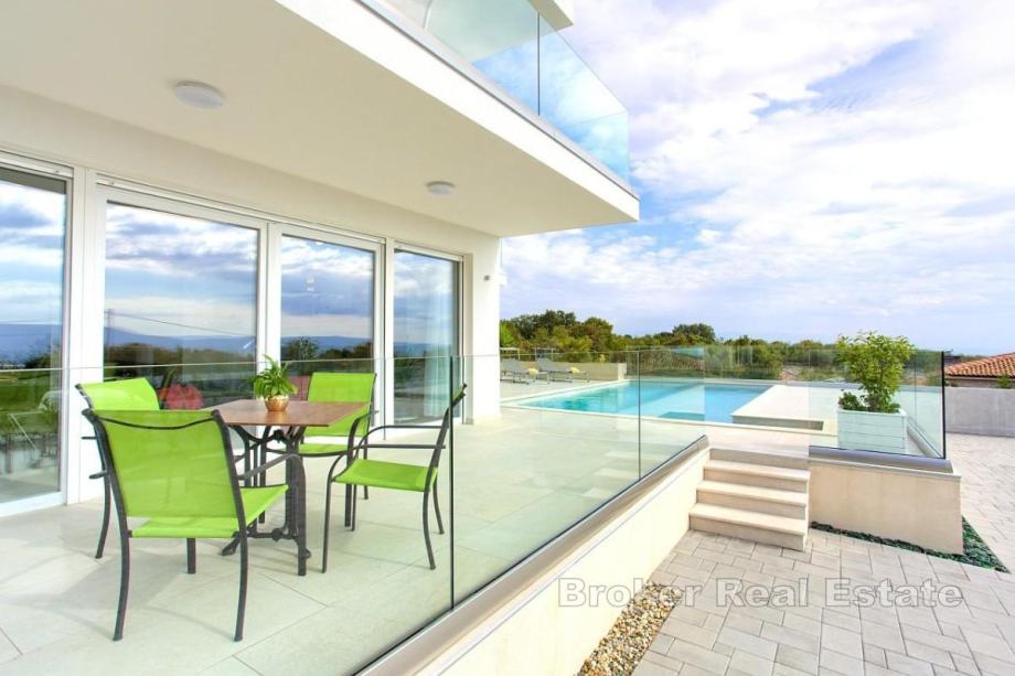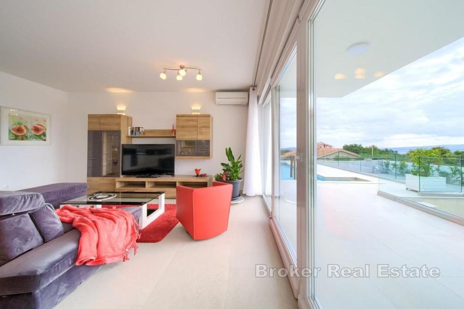 Na prodaju je moderna villa ukupne stambene površine 410 m², smještena u okolici grada Krka, raspoređena na podrum, prizemlje i kat, smještena na parceli od 665 m². U podrumu se nalaze vešeraj, kotlovnica za solarno grijanje vode te centralno grijanje na struju. Prizemlje i prvi kat sadrže četiri apartmana, svaki s kuhinjom, blagovaonicom, dnevnim boravkom, dvjema spavaćim sobama, dvjema kupaonicama i prostranom loggiom ili terasom s otvorenim pogledom na more.