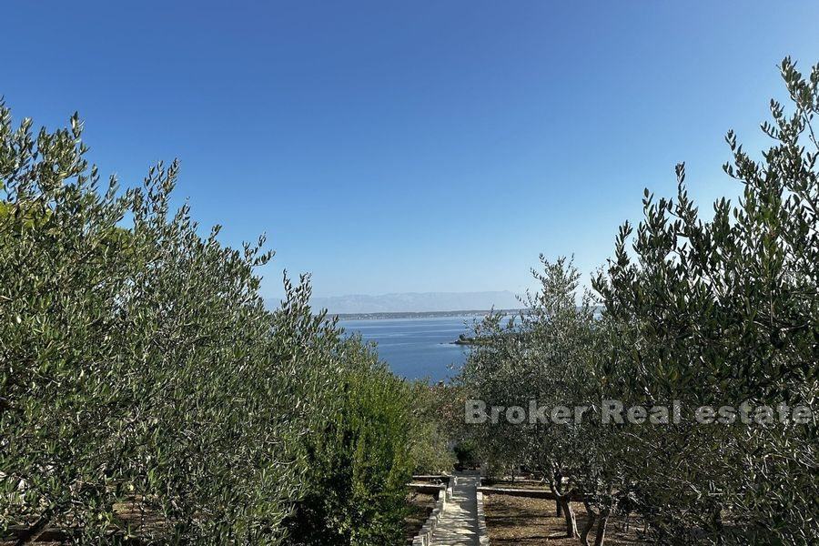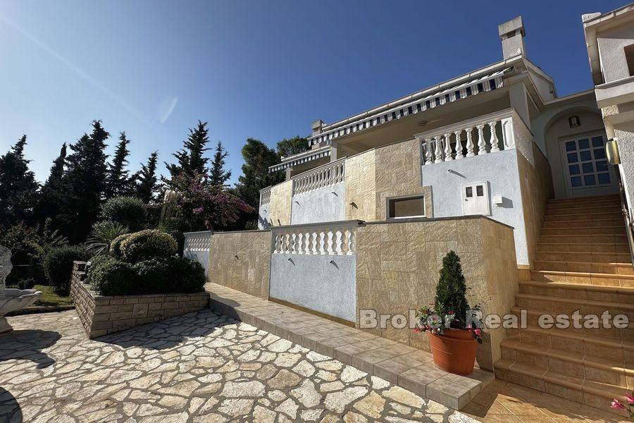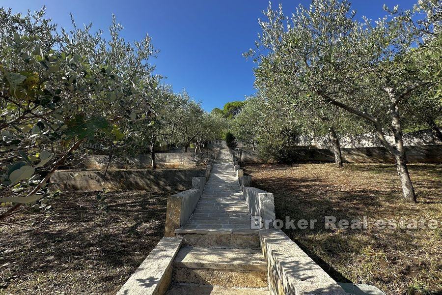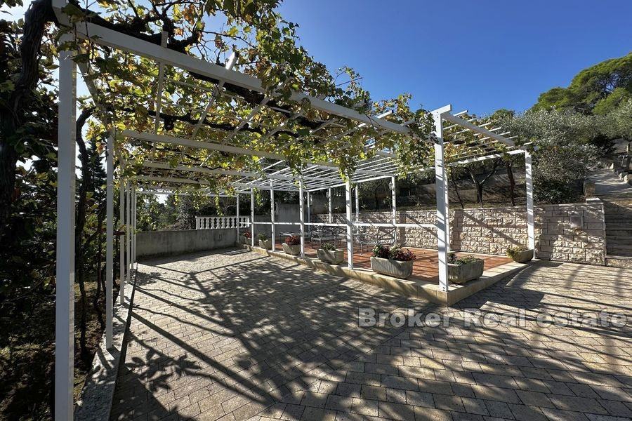 Prostrana okućnica je kultivirana maslinama i voćkama te je uredno održavana. Iza kuće nalazi se veliki prostor za druženje sa kompletnom vrtnom garniturom dok je ostatak zemljišta uređen mediteranskim biljem. Na zemljištu je više nego dovoljno mjesta za bazen.