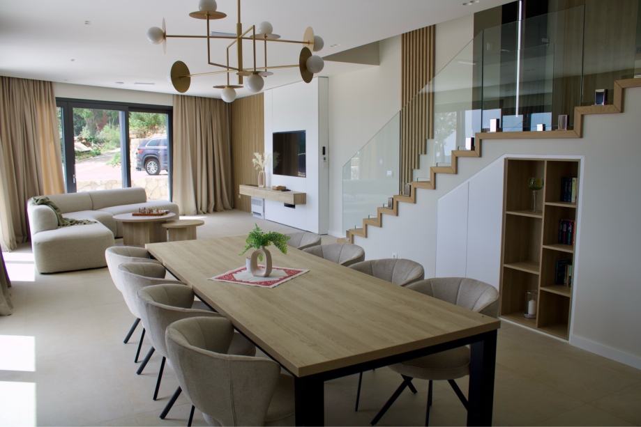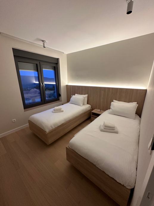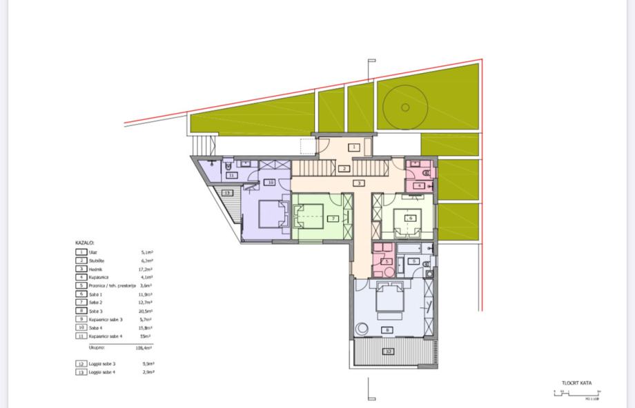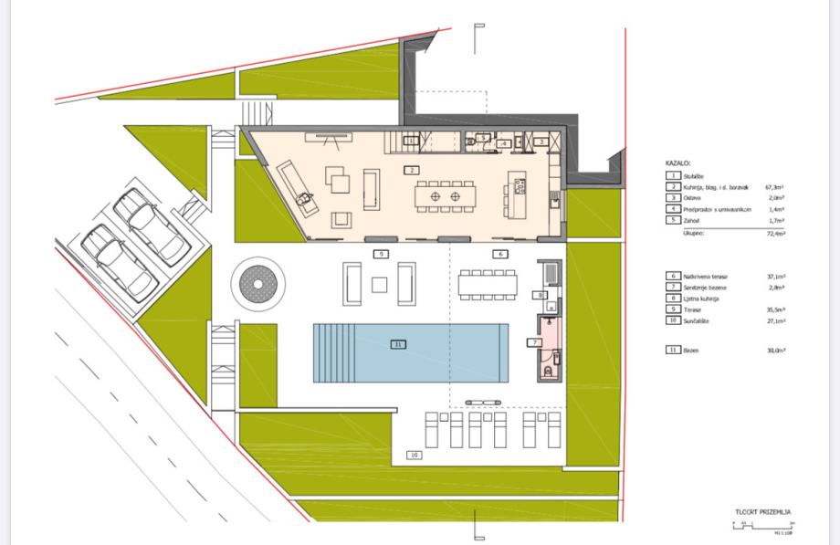 Veličina: unutarnji prostor 180,8 m2 + dva balkona 12,8m2 + natkrivena terasa 37,1 m2 + terasa 35,5 m2 + sunčalište 27,1 m2 + strojarnica bazena 4 m2