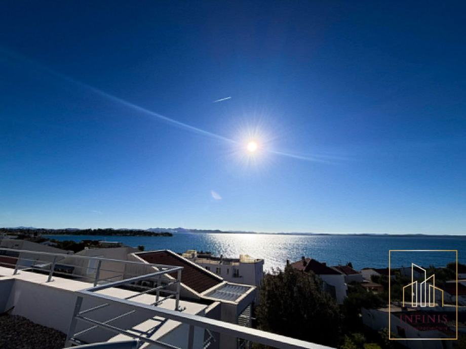 PETRČANE – LUKSUZAN DVOETAŽNI STAN S VRTOM, KROVNOM TERASOM I POGLEDOM NA MORE, samo 80 metara od plaže