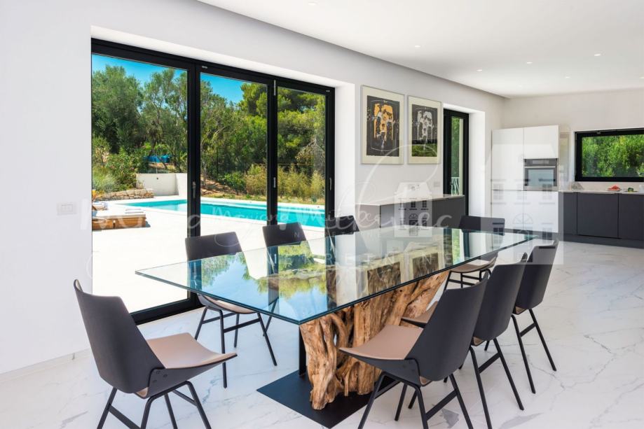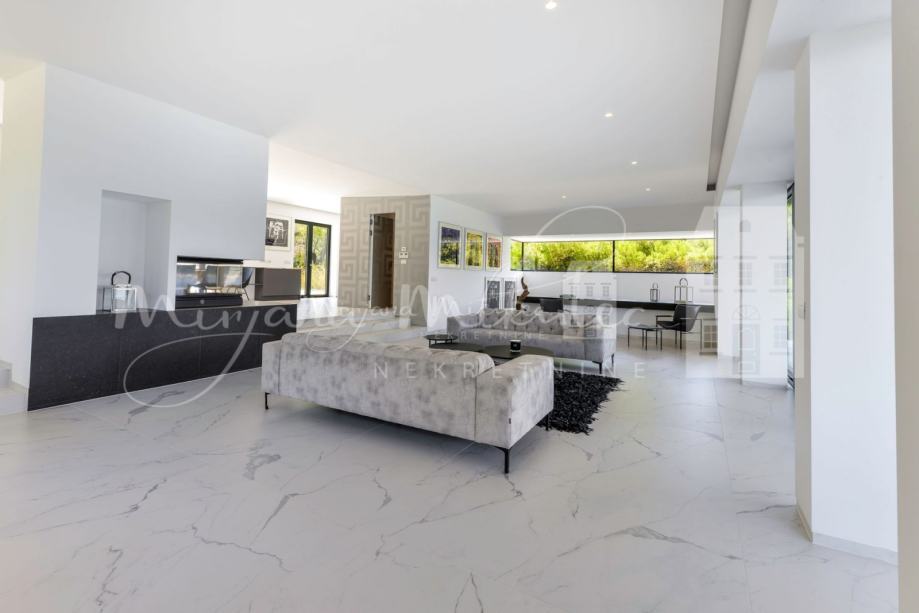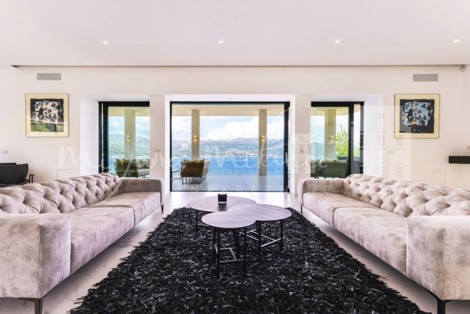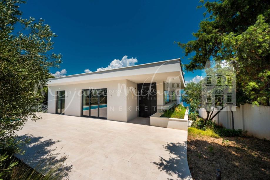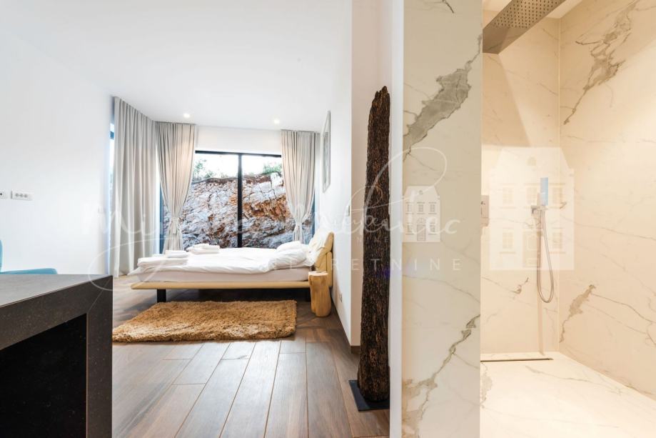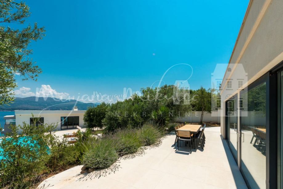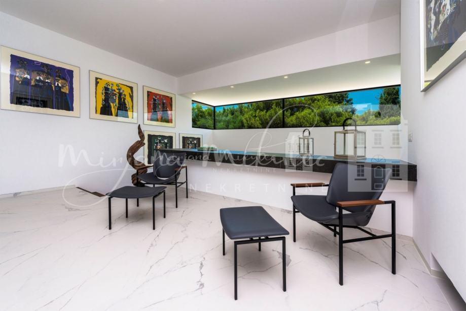 Gornja etaža: open space- kuhinja sa blagovaonicom, dnevni boravak te izlaz na prostranu terasu sa predivnim pogledom na more. Ono što ovu nekretninu čini zanimljivom je to što se dnevni boravak otvara i prema terasi ( moru) sa jedne strane te prema dvorištu sa bazenom ( 12m) sa druge strane. Uz bazen se nalazi vanjski tuš te tzv poolhouse ( pomoćni objekat uz bazen) koje je zapravo apartman od 56 m2 sa terasom od 41 m2.