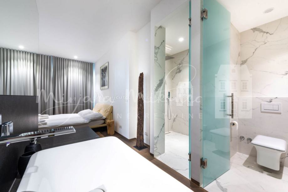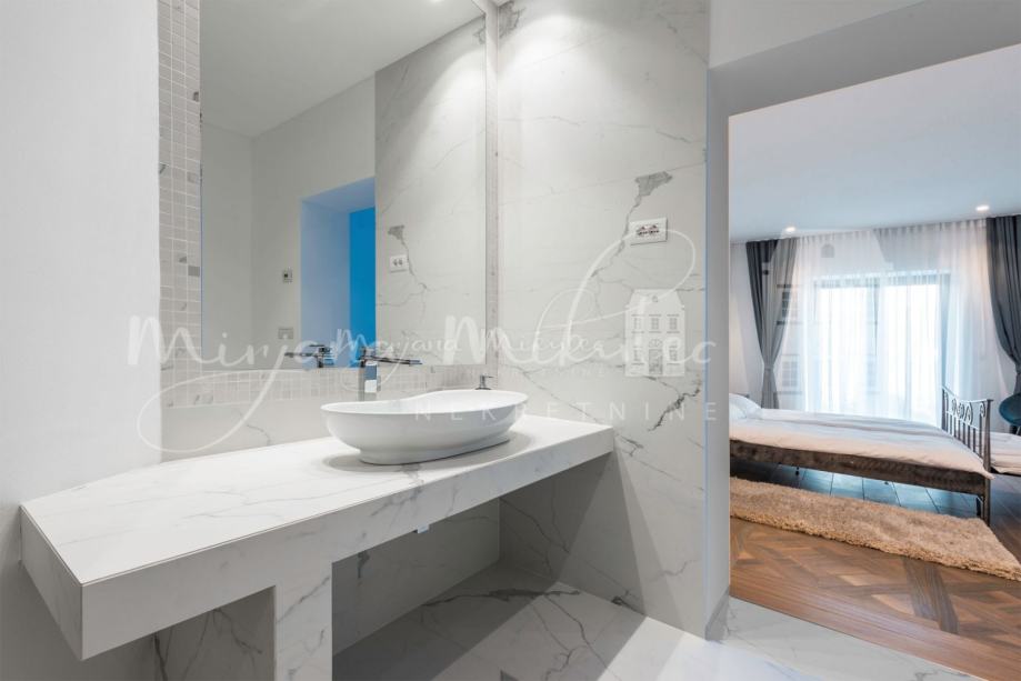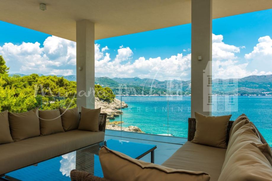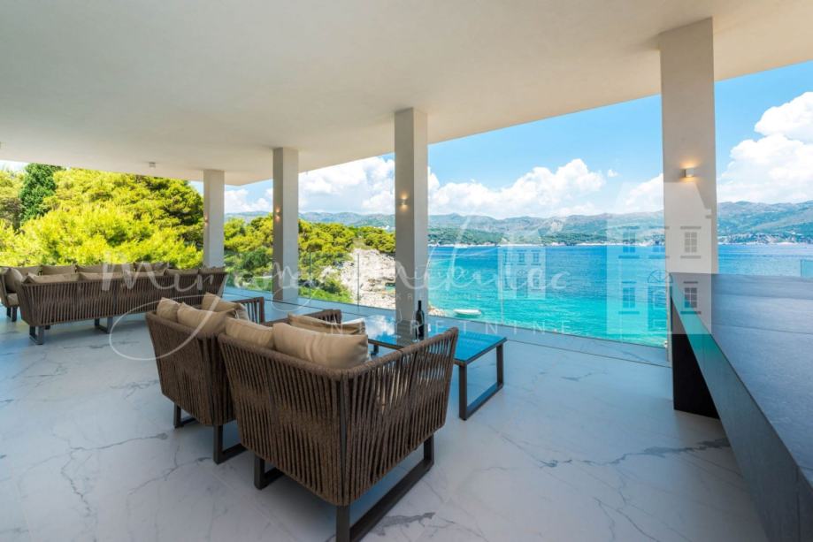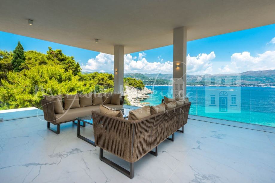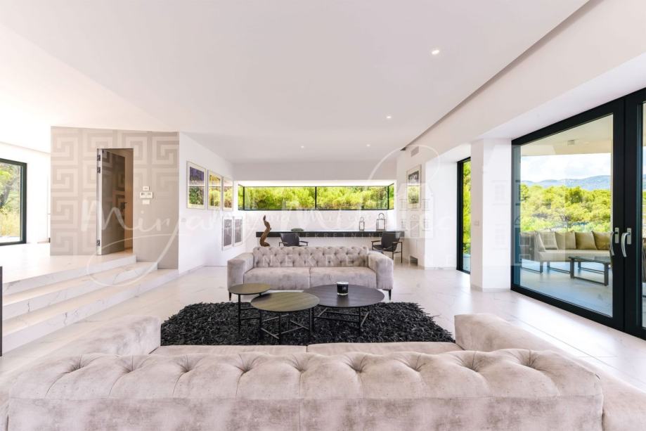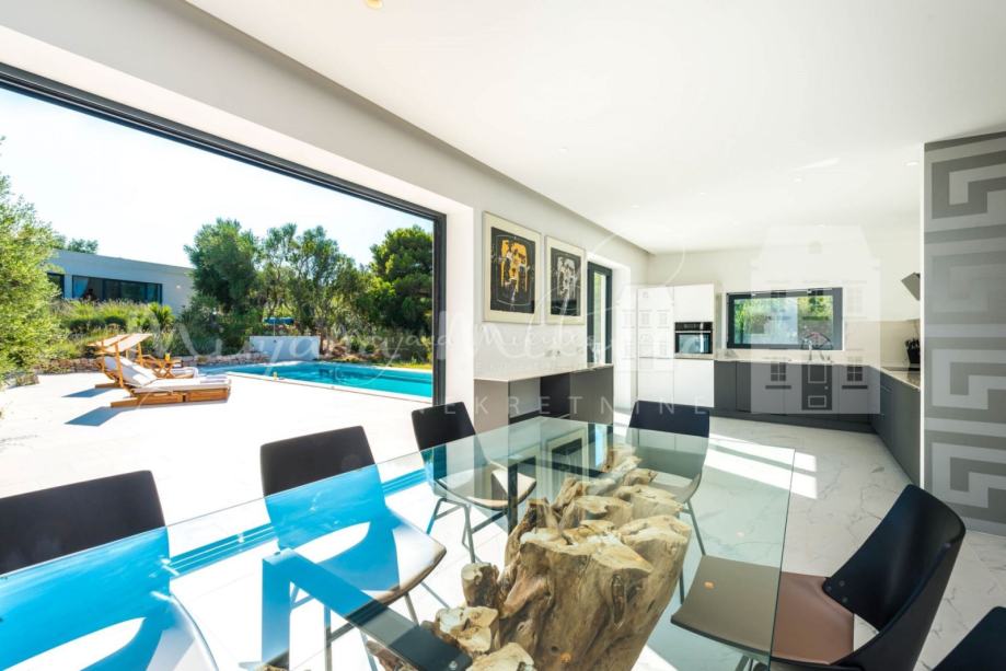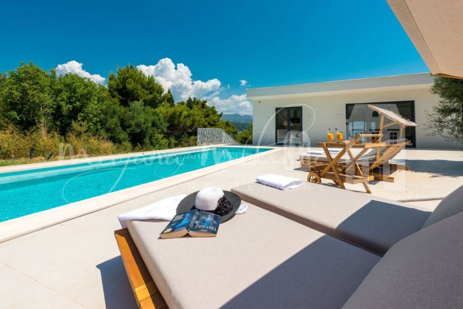 Gornja etaža: open space- kuhinja sa blagovaonicom, dnevni boravak te izlaz na prostranu terasu sa predivnim pogledom na more. Ono što ovu nekretninu čini zanimljivom je to što se dnevni boravak otvara i prema terasi ( moru) sa jedne strane te prema dvorištu sa bazenom ( 12m) sa druge strane. Uz bazen se nalazi vanjski tuš te tzv poolhouse ( pomoćni objekat uz bazen) koje je zapravo apartman od 56 m2 sa terasom od 41 m2.