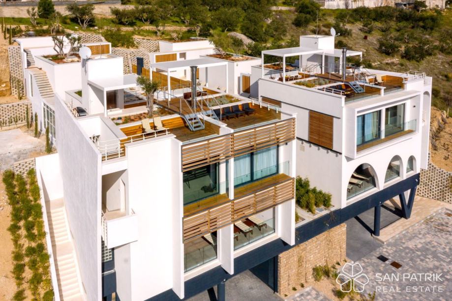 Dvije raskošne vile blizanke s panoramskim pogledom smještene su na parceli ukupne površine 2.253 m2 udaljenoj 200 metara od mora. Moguće je kupiti obje vile zajedno, ili svaku zasebno.
