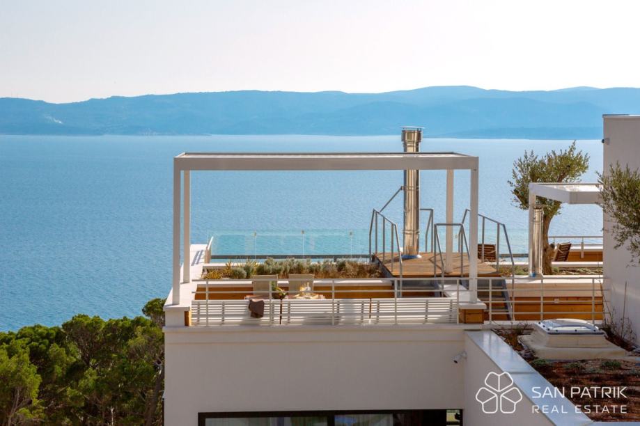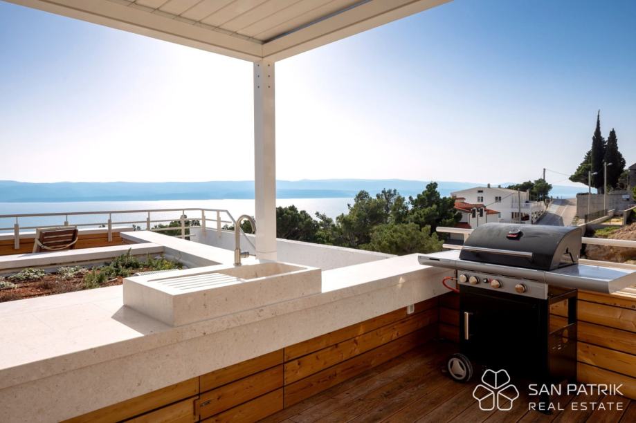 Krovna terasa vile Maestral je vrhunac ove nekretnine. Prostire se na 93 m² i nudi ljetnu kuhinju s plinskim roštiljem, kamenim sudoperom i stolom za blagovanje, idealnim za večernja druženja pod zvijezdama. Bioklimatske pergole pružaju hlad i atmosferu za uživanje u spektakularnim pogledima na otvoreno more i planinske vrhove.