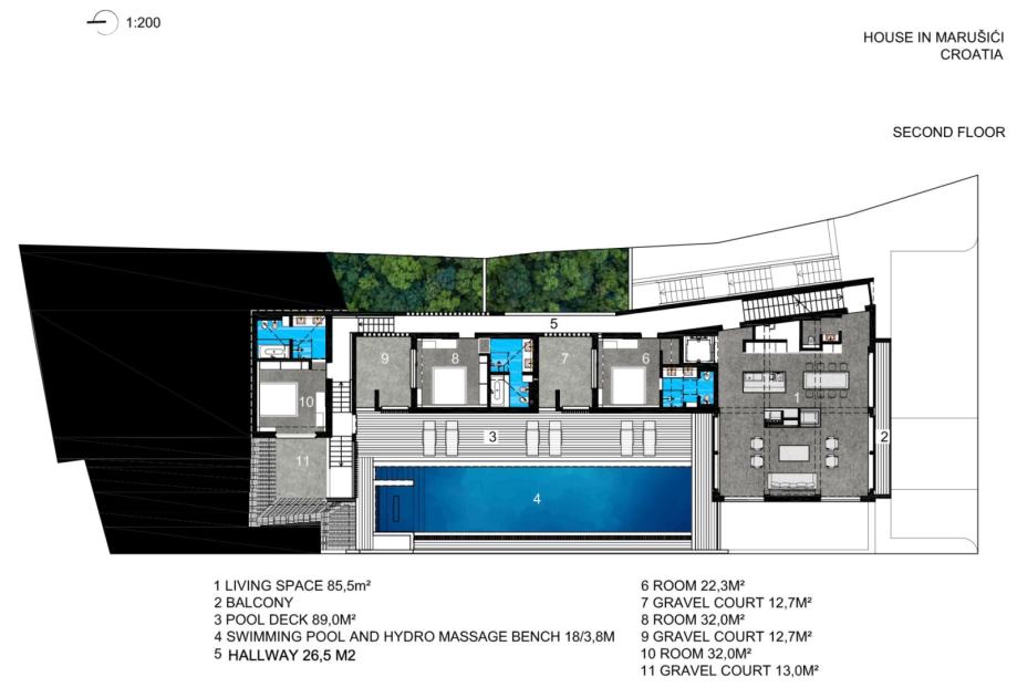 Drugi kat otkriva srce vile - prostrani dnevni boravak s potpuno opremljenom kuhinjom iz koje se pruža pogled na terasu s bazenom od 66 m2. Bazen s hidromasažnom klupom za tri osobe i prostranim sunčalištem nudi savršeno mjesto za uživanje u toplim dalmatinskim danima. Svaka od tri spavaće sobe na ovoj etaži ima vlastitu en-suite kupaonicu, nudeći privatnost i komfor.