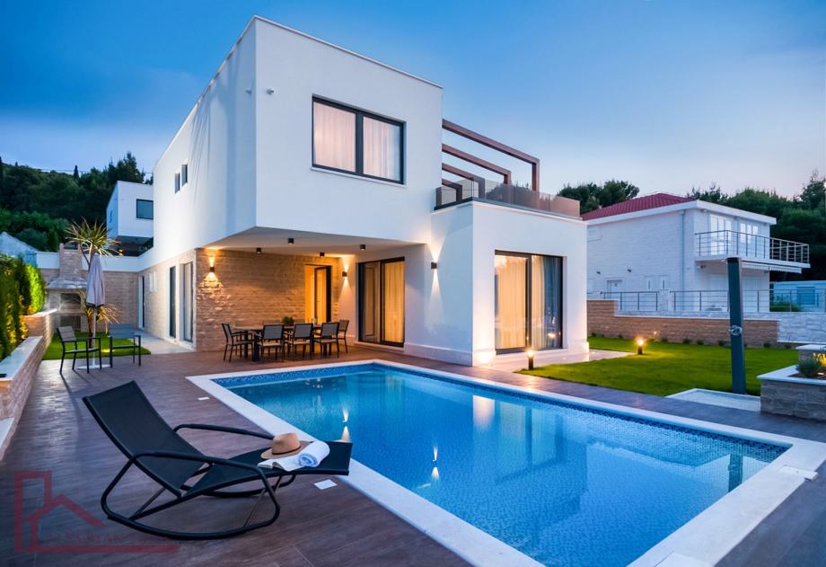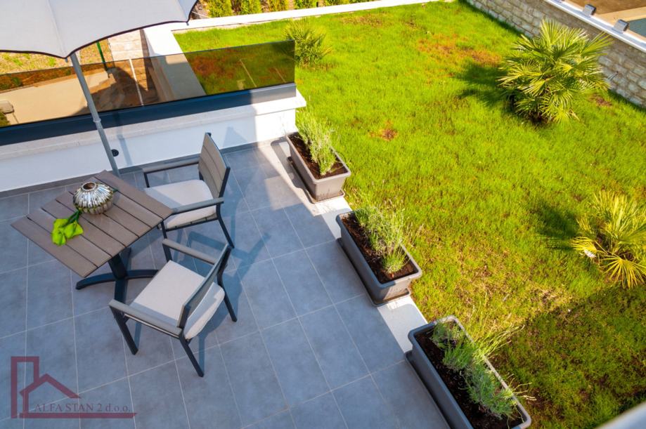 - Prizemlje: otvoreni dnevni prostor – kuhinja, blagovaonica i dnevni boravak s izlazom na veliku terasu i vanjski bazen; dvije dvokrevetne spavaće sobe, svaka s vlastitim kupatilom
