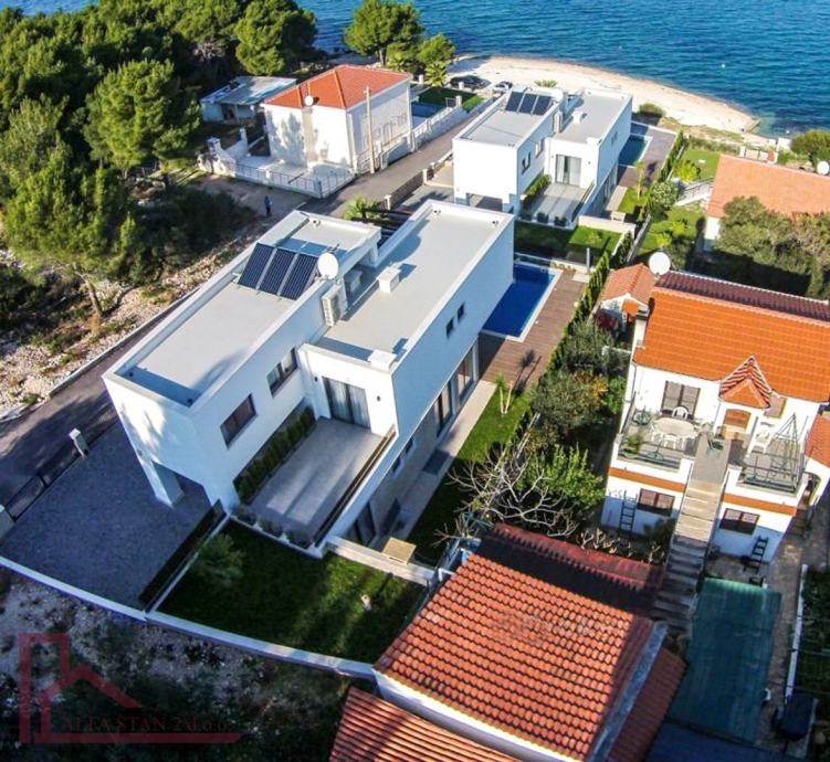 Za više informacija, cijenu i dogovor oko razgledavanja, slobodno nas kontaktirajte na broj mobitela 095/455-2076 (Ines) Ova vrhunski uređena vila smještena je na izuzetnoj lokaciji – drugi red do mora, svega 20 metara od predivne prirodne plaže u Okrugu Gornjem. Nalazi se tik uz zaštićenu borovu šumu i zelenu zonu, na jednoj od posljednjih građevinskih parcela u tom dijelu, što garantira mir, privatnost i izdvojenost od turističke gužve.
