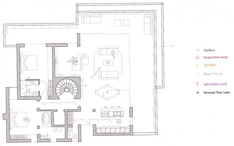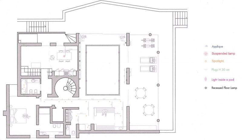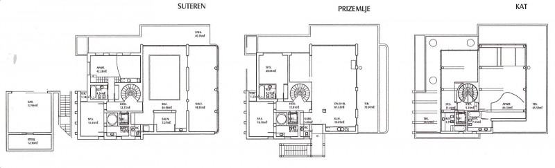 U prizemlju se nalazi garaža, strojarnica, apartman za goste, 2 kupaone, spavaća soba, 2 terase, spremište, wc, sauna i bazen.