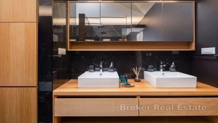 Elegantno raspoređen i iskorišten prostor na četiri etaže. Na etaži prizemlja nalazi se natkriveni parking za četiri vozila te punionica za električne automobile. Unutar vile u prizemlju nalazi se jedinstven termalni labirint pogodan za energetsku učinkovitost potrošnje energije te strojarnica.