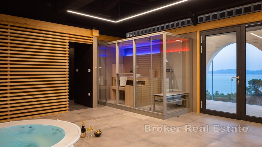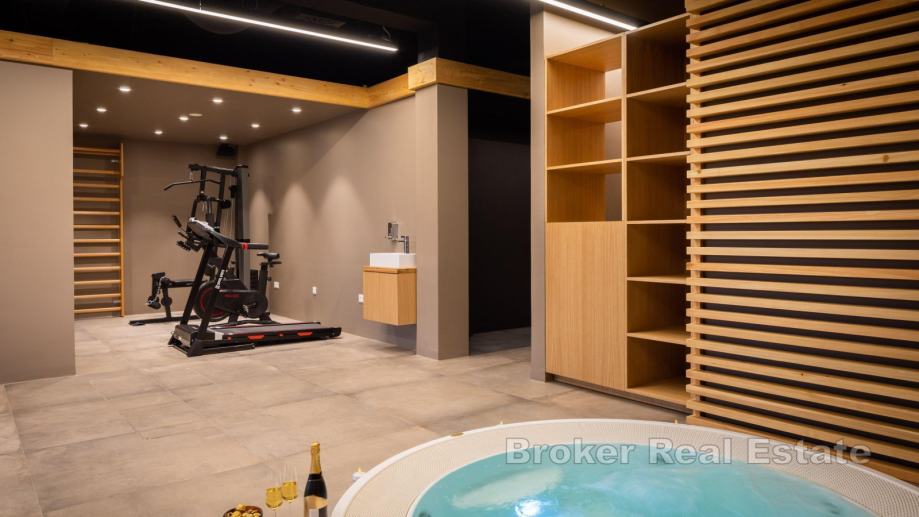 Na etaži prvog kata nalazi se pomno osmišljen i bogato opremljen wellness. Sastoji se od ulaznog predsoblja, teretane, hidro-masažnog jacuzzi-a, tropskog tuša, saune, sobe za opuštanje te velike terase s koje se pruža jedinstven pogled na more i prirodu.
