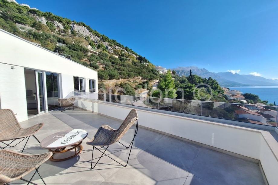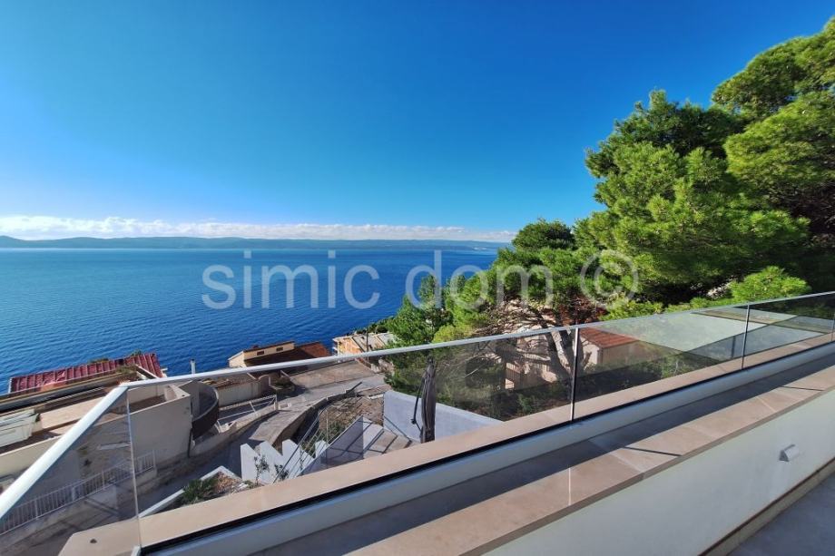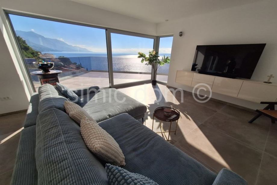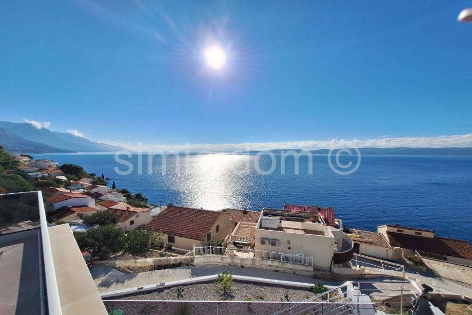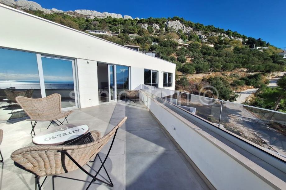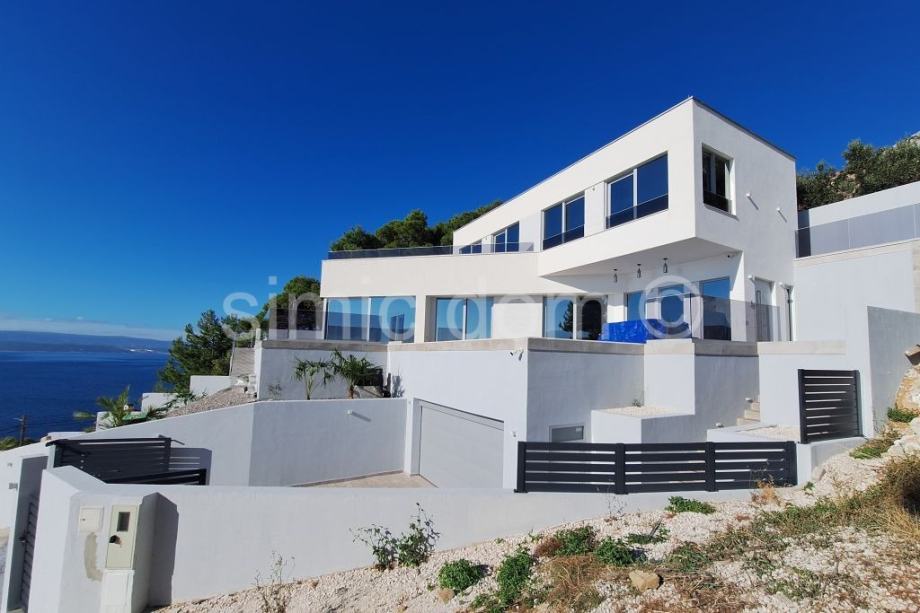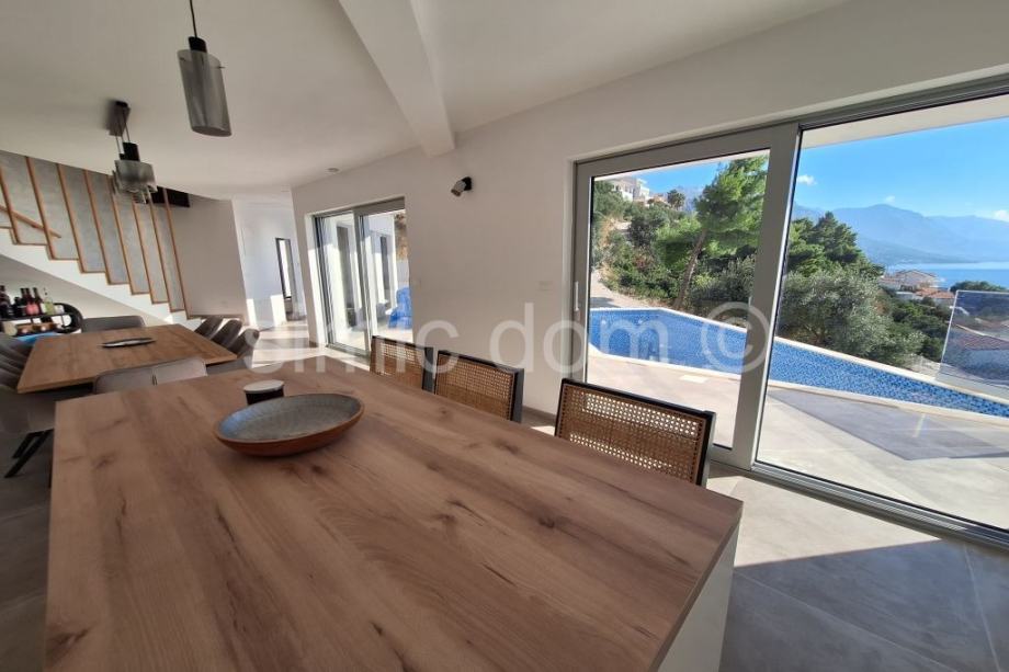 Posredujemo u prodaji prekrasne, novosagrađene vile sa spektakularnim pogledom na more, otoke i cijelo okolno područje. Vila se smjestila u malom mjestu na Omiškoj rivijeri i od samog je Omiša udaljena otprilike 15 minuta vožnje. Površina vile je 220m2 te se prostire etažama prizemlja i prvog kata. U prizemlju se smjestio impozantan dnevni boravak s kuhinjom te malim toaletom. Iz dnevnog se djela izlazi na impresivnu terasu koja ima i bazen, jacuzzi te ljetnu kuhinju, a tu je i manje spremište. Na katu su tri spavaće sobe s tri kupaonice. I ova razina kuće nudi veliku terasu, idealnu za mirne ljetne večeri. Kuća se posebno ističe velikim staklenim stijenkama koje nude privatnost jer su izvana zatamnjene, a vlasnicima ujedno omogućuju neometano uživanje u impresivnom pogledu. Nadalje, kuća se odlikuje i inovativnim sustavom grijanja i hlađenja nenametljivo skrivenim u zidove, kao i nizom drugih modernih rješenja. Vila se prodaje potpuno opremljena i namještena vrlo atraktivnim namještajem i vrhunskim kućnim aparatima, pružajući tako osjećaj prikrivenog luksuza. Vila ima i garažu te dodatno spremište. Najbliže su plaže udaljene nekoliko minuta šetnje, a u samom je mjestu dostupno i niz sadržaja poput restorana, kafića, trgovina… Vlasništvo uredno.