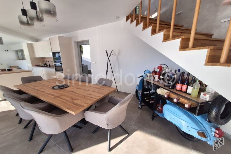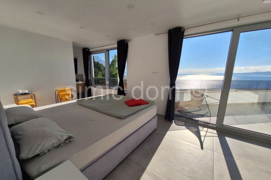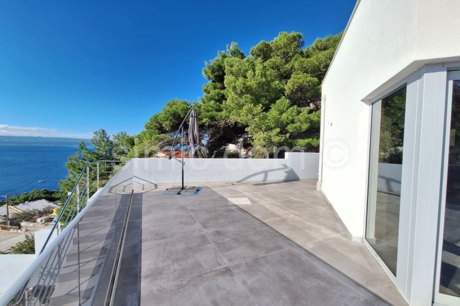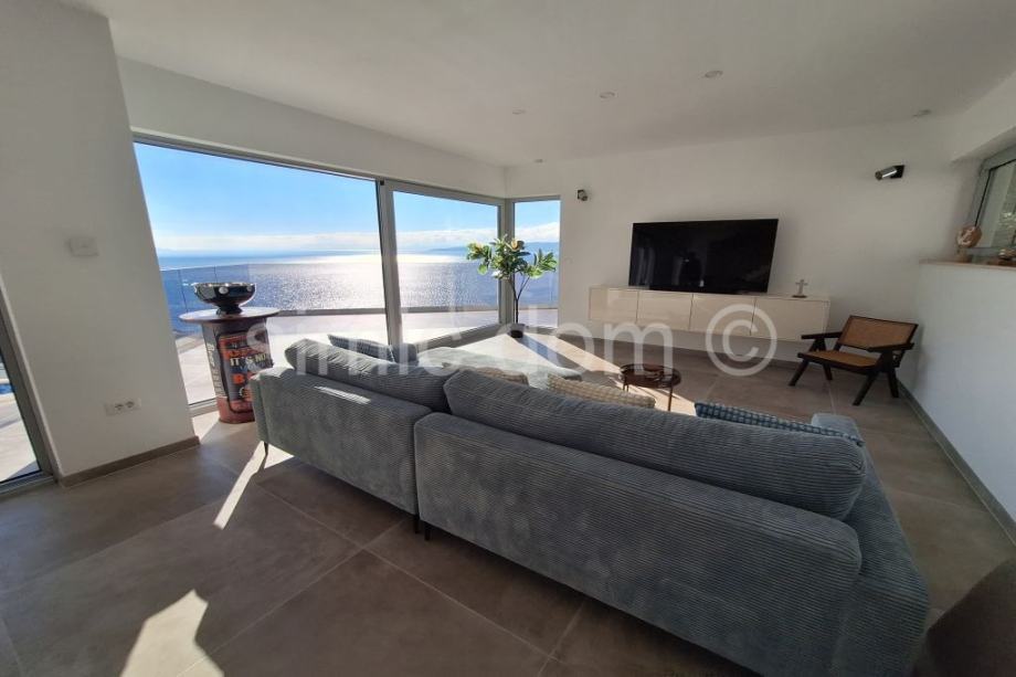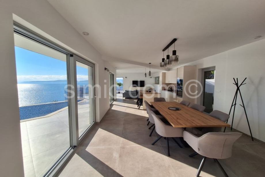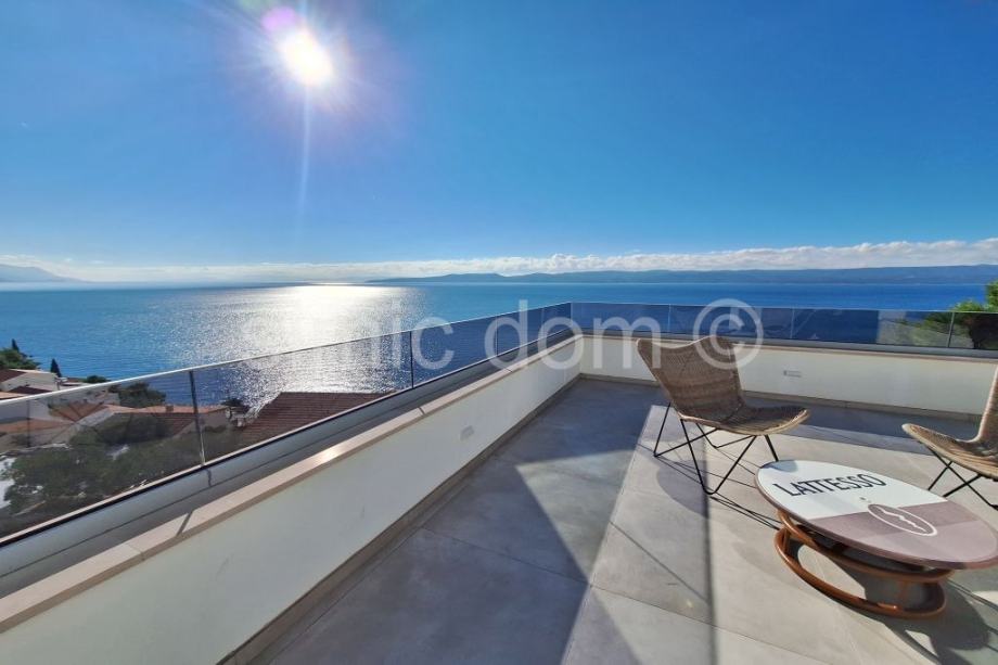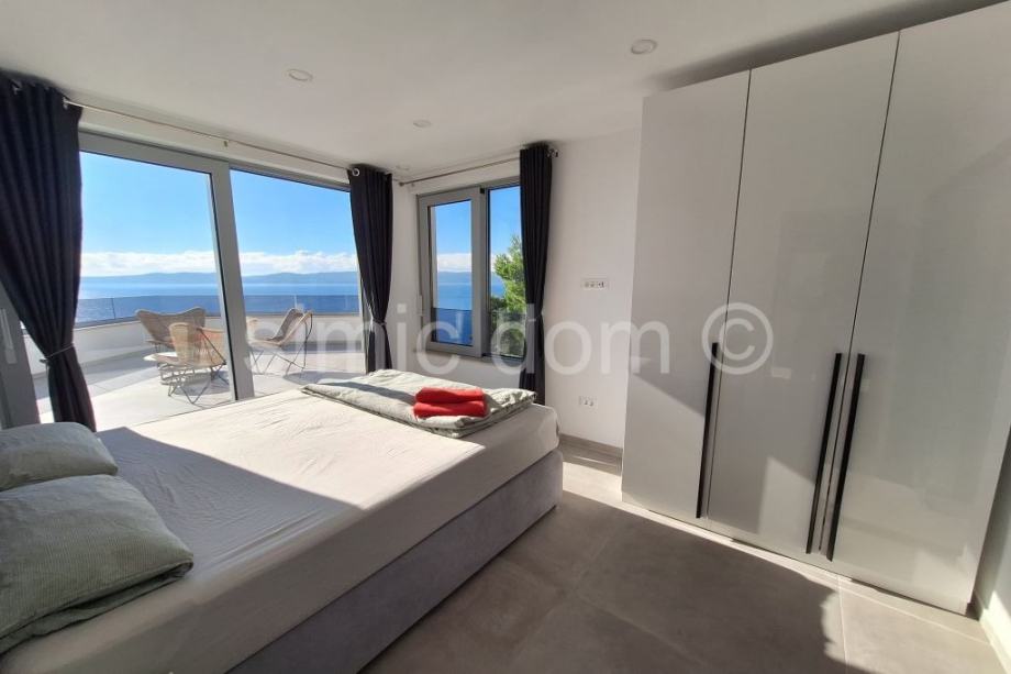 Posredujemo u prodaji prekrasne, novosagrađene vile sa spektakularnim pogledom na more, otoke i cijelo okolno područje. Vila se smjestila u malom mjestu na Omiškoj rivijeri i od samog je Omiša udaljena otprilike 15 minuta vožnje. Površina vile je 220m2 te se prostire etažama prizemlja i prvog kata. U prizemlju se smjestio impozantan dnevni boravak s kuhinjom te malim toaletom. Iz dnevnog se djela izlazi na impresivnu terasu koja ima i bazen, jacuzzi te ljetnu kuhinju, a tu je i manje spremište. Na katu su tri spavaće sobe s tri kupaonice. I ova razina kuće nudi veliku terasu, idealnu za mirne ljetne večeri. Kuća se posebno ističe velikim staklenim stijenkama koje nude privatnost jer su izvana zatamnjene, a vlasnicima ujedno omogućuju neometano uživanje u impresivnom pogledu. Nadalje, kuća se odlikuje i inovativnim sustavom grijanja i hlađenja nenametljivo skrivenim u zidove, kao i nizom drugih modernih rješenja. Vila se prodaje potpuno opremljena i namještena vrlo atraktivnim namještajem i vrhunskim kućnim aparatima, pružajući tako osjećaj prikrivenog luksuza. Vila ima i garažu te dodatno spremište. Najbliže su plaže udaljene nekoliko minuta šetnje, a u samom je mjestu dostupno i niz sadržaja poput restorana, kafića, trgovina… Vlasništvo uredno.