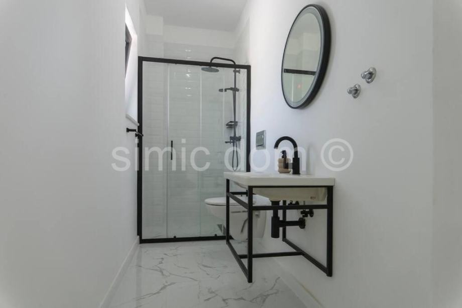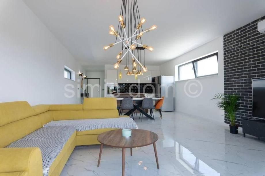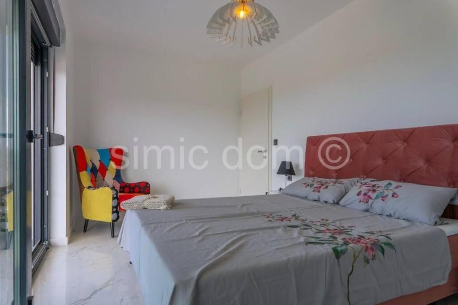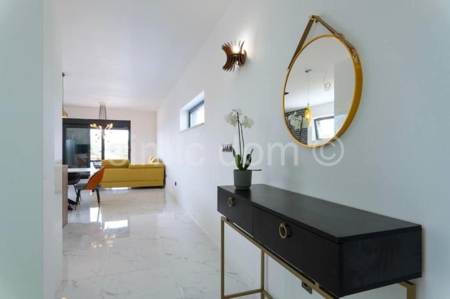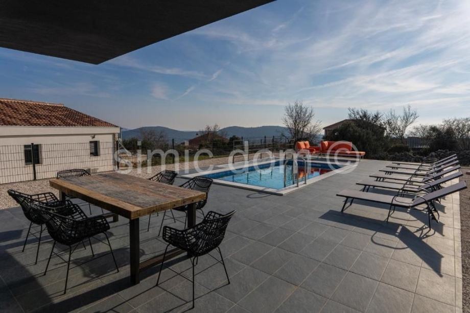 Posredujemo u prodaji prekrasne vile, stare tek dvije godine, a koja se smjestila na vrlo mirnoj lokaciji s otvorenim pogledom na more i cijelo mjesto. Površina vile je 180m2 te ima etaže prizemlja i prvog kata s ukupno tri spavaće sobe, dvije kupaonice te impresivnim dnevnim boravkom s kuhinjom i blagovaonicom. Ova se lijepa vila posebno ističe velikom terasom s grijanim bazenom i atraktivno uređenom okućnicom koja nudi i parkirno mjesto. Kuća je vrlo moderno i funkcionalno namještena vrhunskom opremom (više klimatizacijskih uređaja, alarmni sustav, moderna keramika i stolarija, itd.) što u kombinaciji s iznimnom kvalitetom gradnje jamči visoku isplativost investicije. Lokacija je vrlo mirna (iznad samog mjesta), a svi sadržaji poput dućana i restorana se nalaze unutar manje od 5 minuta vožnje. Nekretnina je odmah useljiva. Vlasništvo uredno.