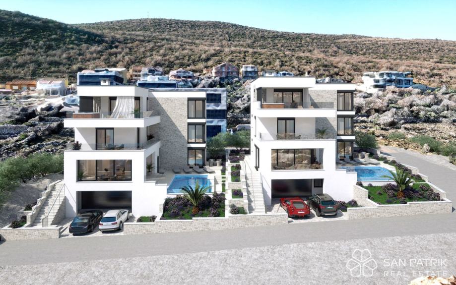 Vila Paklenica2 - podrum + prizemlje + 1. kat + 2. kat - stambena površina 258 m2 (4 spavaće sobe + 4 kupaonice) + 3 terase + bazen 30 m2 sa sunčalištem + vrt + garaža za 2 automobila, ukupna neto obračunska površina 355 m2 na parceli površine 480 m2 = 2.000.000 EUR (s uključenim PDV-om)