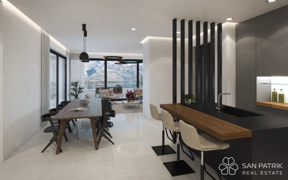 Vila je raspoređena na četiri etaže – podrum, prizemlje, prvi i drugi kat, s ukupnom neto obračunskom površinom od 342 m2. Stambeni dio prostire se na 260 m2 i obuhvaća četiri prostrane spavaće sobe s vlastitim kupaonicama, dodatna dva toaleta za goste, prozračni dnevni boravak s kaminom i blagovaonicu povezanu s potpuno opremljenom kuhinjom. Velike staklene stijene povezuju unutrašnjost s terasama i bazenom, pružajući neprekidni doživljaj prirode i svjetlosti.