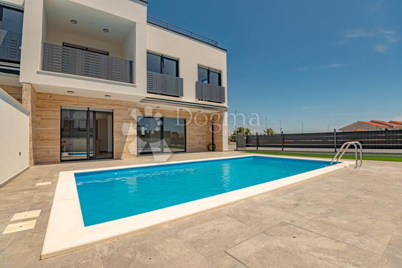 Vila ima ukupno korisnu površinu od 135,82 m², ima dvije etaže: prizemlje + 1. kat + prohodnu krovnu terasu. Prizemlje kuće sastoji se od kuhinje s blagovaonicom i dnevnim boravkom, predsoblja, spremišta, gostinjskog wc-a; unutarnje stubište vodi na 1. kat gdje su smještene 3 spavaće sobe i dvije kupaonice. Krovna terasa ima površinu od 52 m², sunčalište s pripremom za mogući jacuzzi. Okućnica je u potpunosti ograđena ima 200 m² s prostranim parkirnim prostorom, prostor za vanjski roštilj, bazen površine 22 m². Vile su udaljene 1600 m od plaže i 1300 m od centra grada. Vila je građene su po visokom standardu kvalitete, opremljena s: