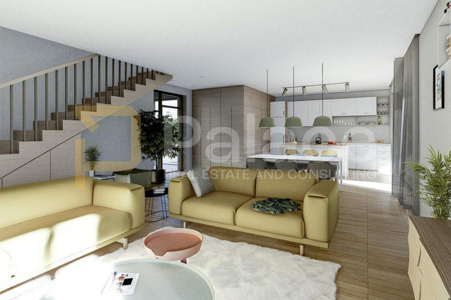 Stambena površina vile iznosi 283 m², a raspoređena je na dvije etaže. U prizemlju se nalazi suvremeni dnevni prostor otvorenog koncepta, s elegantno povezanom kuhinjom, blagovaonicom i dnevnim boravkom. U prizemlju su dodatno smještena unutarnja i vanjska spremišta, prostor predviđen za saunu ili fitness, te izlaz na natkrivenu terasu s ljetnom kuhinjom. Terasa vodi do grijanog bazena s masažnim dijelom, ukupne površine 48 m², idealnog za potpuni užitak u toplijim mjesecima.
