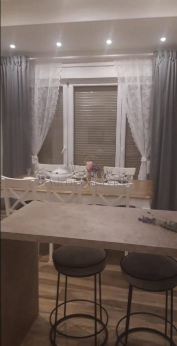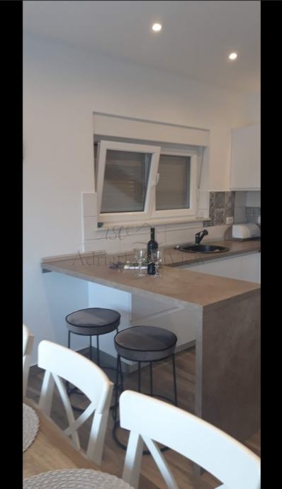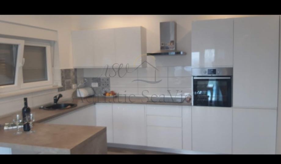 U prizemlju se nalazi moderni i potpuno opremljeni open space dnevni boravak s kuhinjom i blagavaonom. Prostor se nastavlja na terasu s bazenom i lijepo održavanim okolišem , te zadivljujućim pogledom . Na istom katu se nalazi kupaonica i jedna spavaća soba.