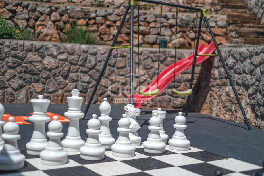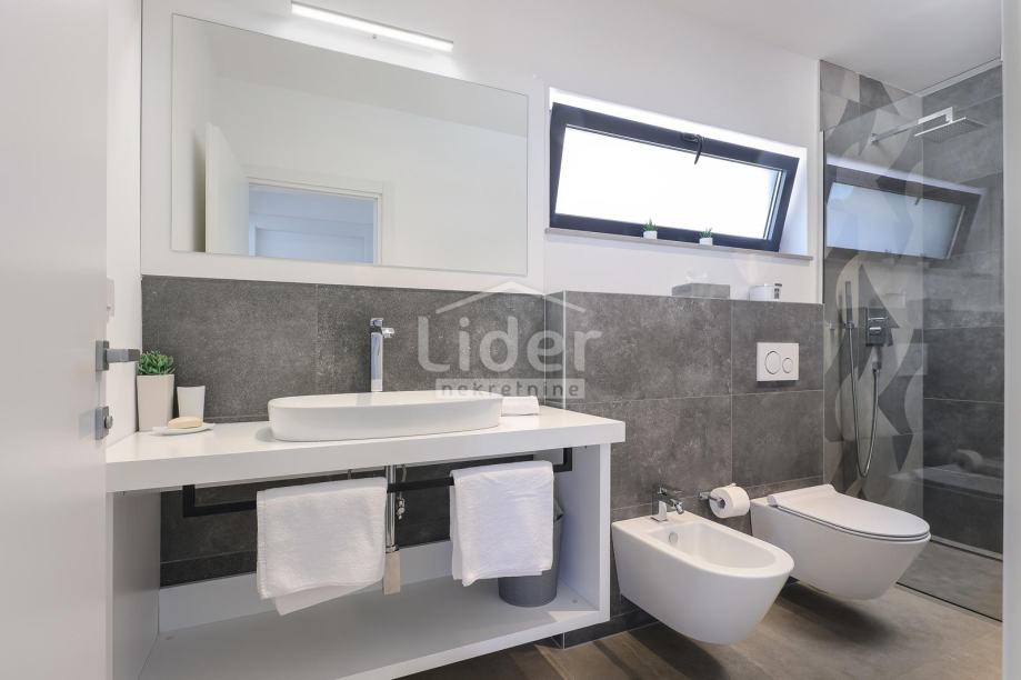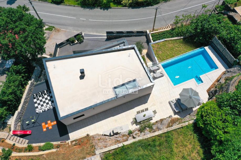 Suteren je opremljeno teretanom i garažom za vaše vozilo. U prizemlju nalaze se još dvije spavaće sobe, dodatne kupaonice te studio apartman s kuhinjom, dnevnim boravkom s kaučem na razvlačenje i kupaonicom. Prvi kat vile sastoji se od otvorenog, ukusno namještenog dnevnog boravka i blagovaonice, povezane s potpuno opremljenom kuhinjom. Na ovom katu nalazi se i jedna spavaća soba s vlastitom kupaonicom. Ukupno, interijer vile uključuje 3 spavaće sobe, svaka s balkonom s pogledom na more.