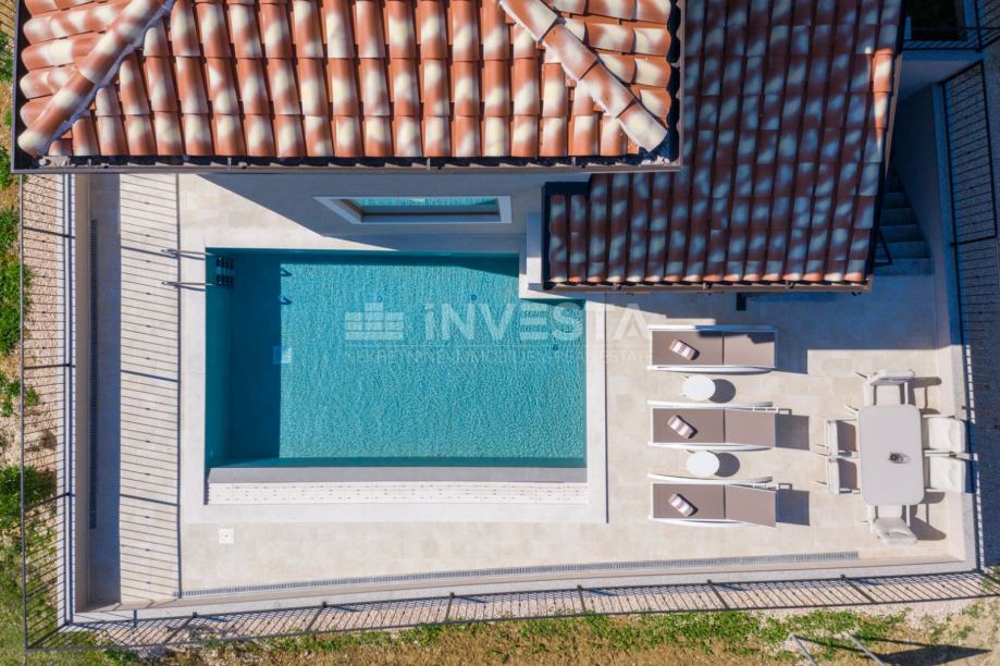 Iz dnevnog dijela izlazi se na natkrivenu terasu, koja stepenicama vodi prema dvorištu s bazenom i ljetnom kuhinjom – prostoru idealnom za opuštanje, obiteljska druženja i ljetne večere na otvorenom.