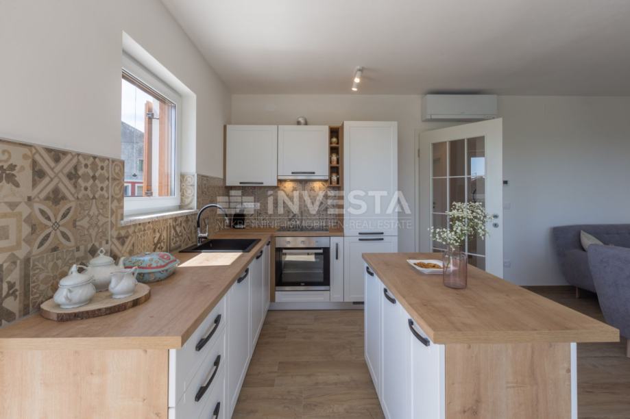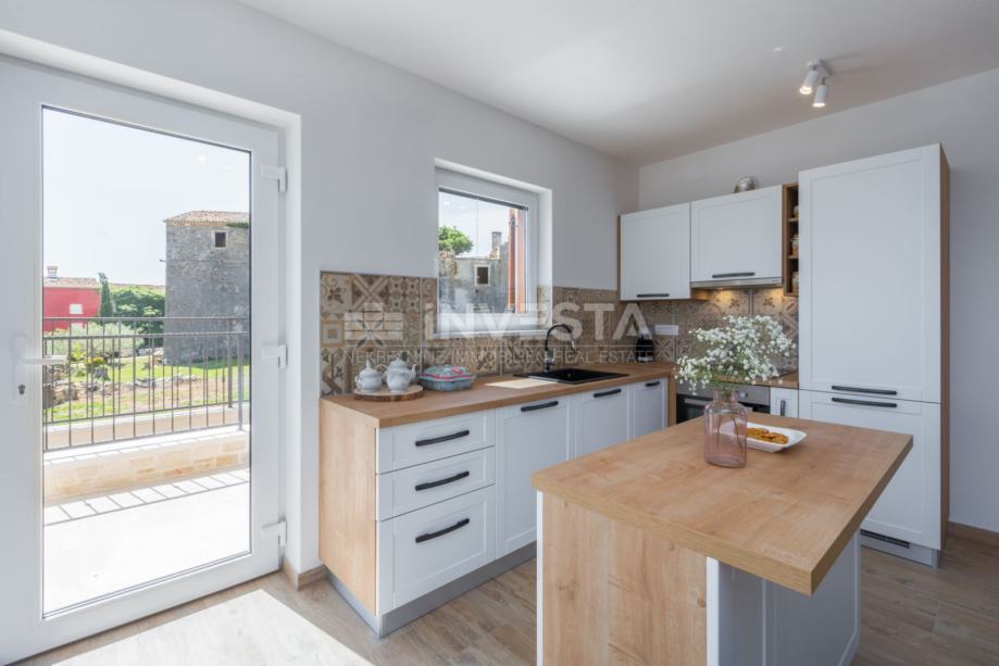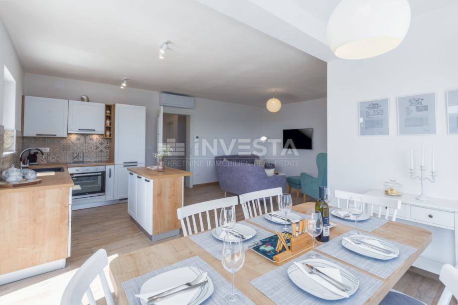 Kuhinja je u potpunosti opremljena i funkcionalno povezana s blagovaonicom u kojoj je smješten stol za šest osoba. Veliki panoramski prozor omogućuje obilje dnevnog svjetla te otvara pogled prema moru i slikovitom istarskom krajoliku.