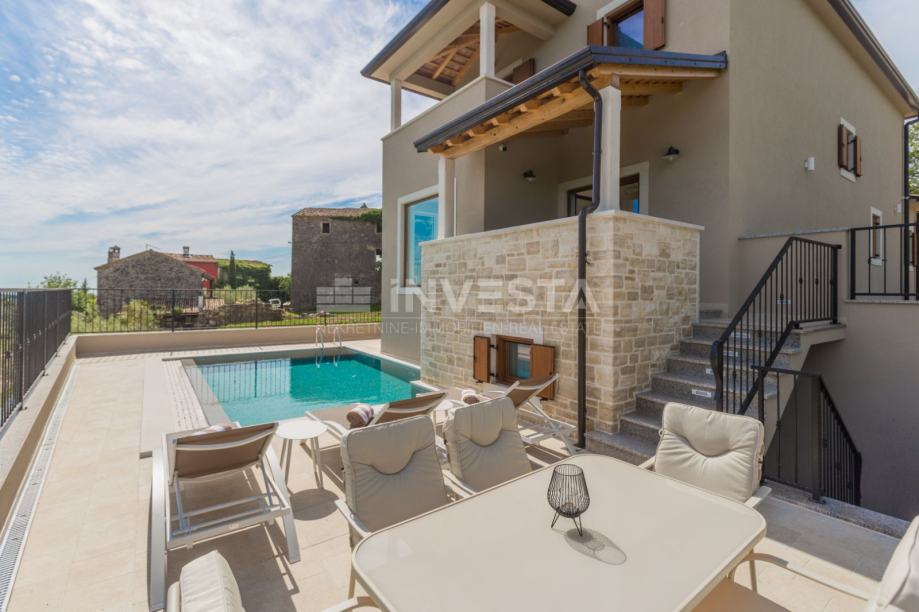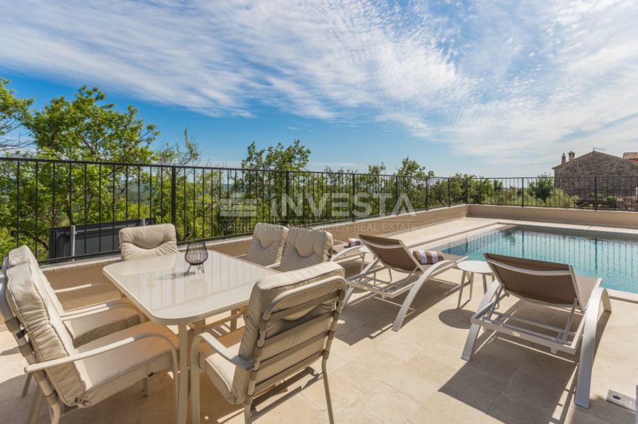 Predstavljamo Vam atraktivnu kuću za odmor ukupne neto površine 158,17 m² s bazenom, smještenu u mirnom dijelu sjeverozapadne Istre. Nekretnina se nalazi na iznimnoj lokaciji koja pruža panoramski pogled na more, dolinu rijeke Mirne i valovite istarske brežuljke, stvarajući poseban osjećaj mira, privatnosti i povezanosti s prirodom.