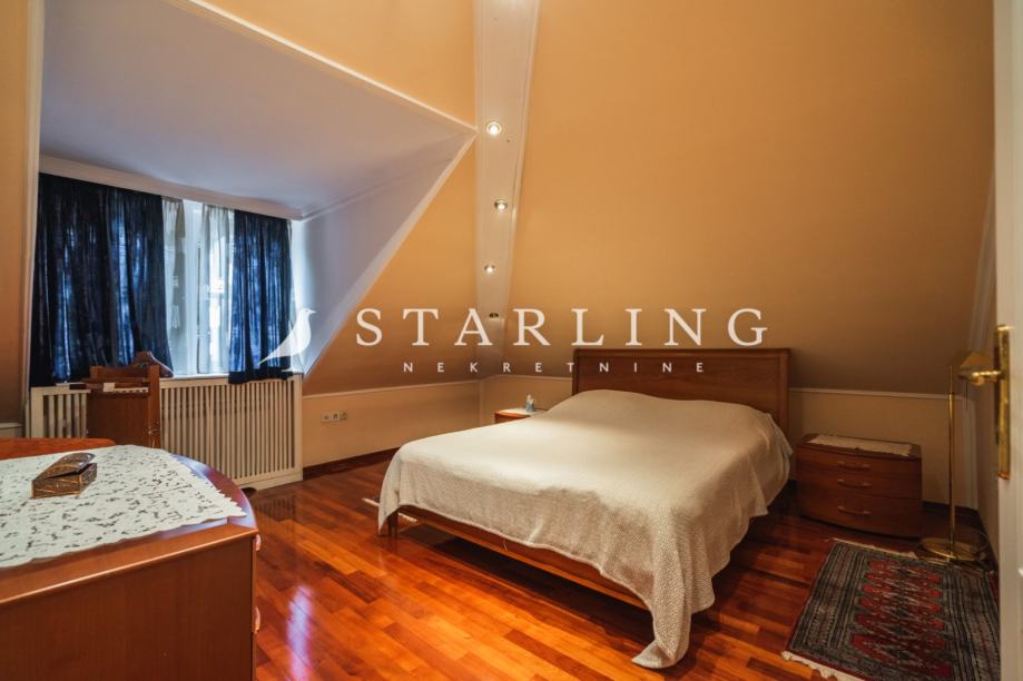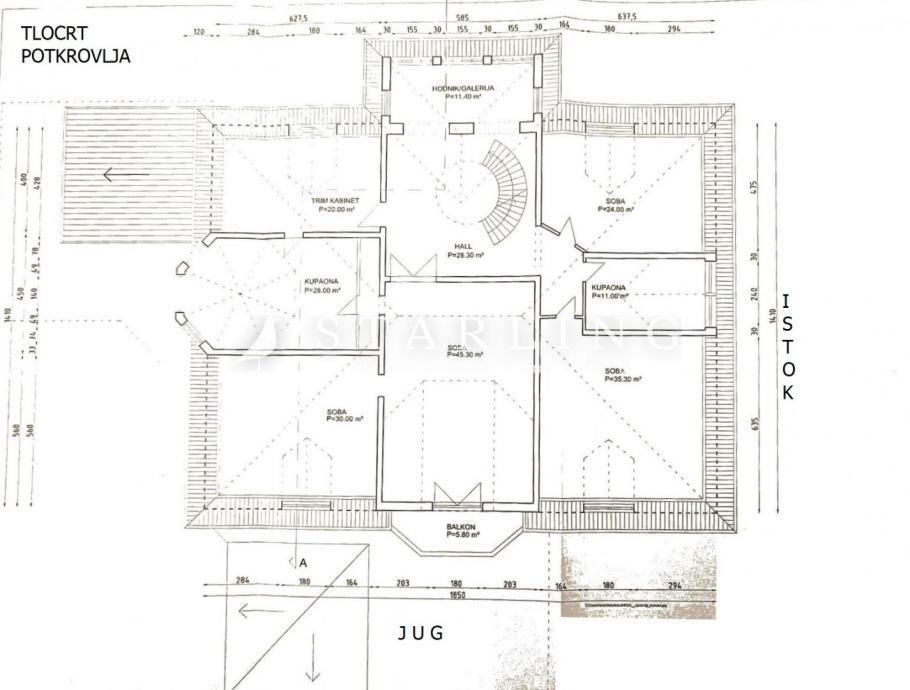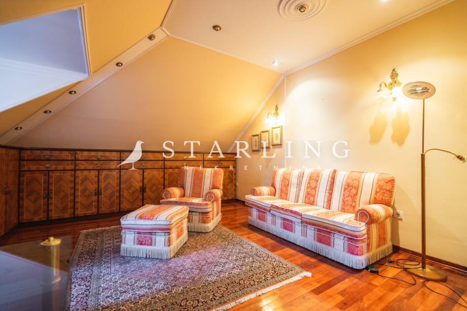 U potkrovlju kuće (235 m2) nalazi se master soba s kupaonicom, garderobom i terasom, tri spavaće sobe, dvije garderobe, kupaonica, galerija i hodnik.