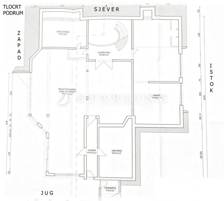 U podrumu (311 m2) kuće se nalazi prostor s bazenom, jacuzzijem, finska i bio sauna, kupaonice i wc-a, garaža, kotlovnica, vešeraj, vinoteka i soba za odmor. S prostora bazena je moguće pristupiti vrtu.