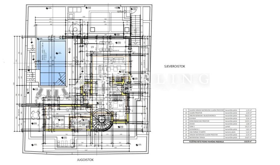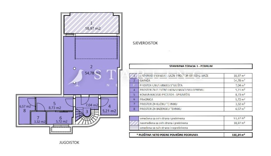 PODRUM: natkriveni vanjski ulazni prostor ispred garaže, garaža za dva automobila, unutarnje stubište te pomoćni prostori: komunikacijski prostor sa spremištem, praonica, prostor za kućnu tehniku, prostor za bazensku tehniku, te prostor za elektro i komunikacijsku opremu.