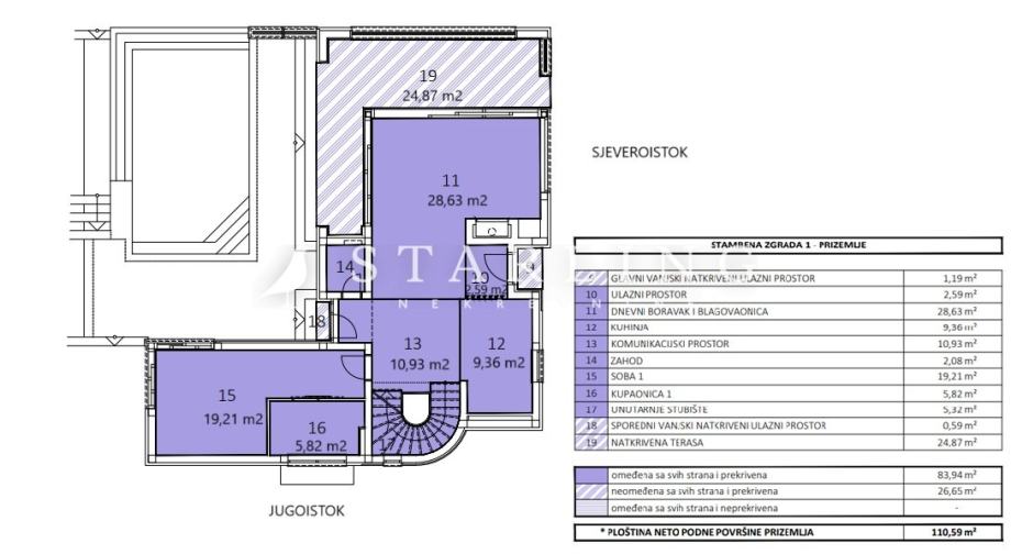 PRIZEMLJE: vanjski natkriveni ulazni prostori, prostor dnevnog boravka, blagovaonice i kuhinje, unutarnje stubište, soba s vlastitom kupaonicom, izdvojeni wc i te vanjska natkrivena terasa.