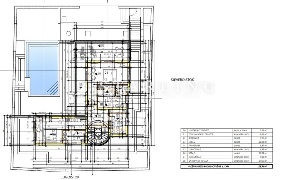 PRVI KAT: dvije sobe s vlastitim kupaonicama odnosno garderobom, igraonica, unutarnje stubište te vanjska natkrivena terasa.