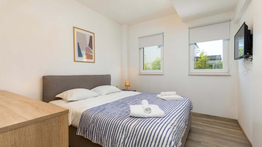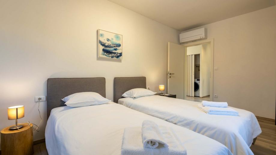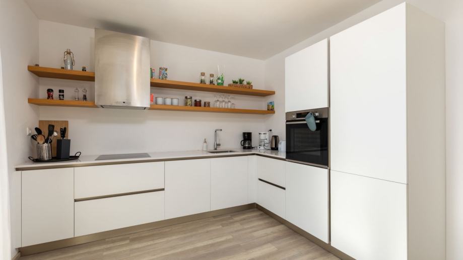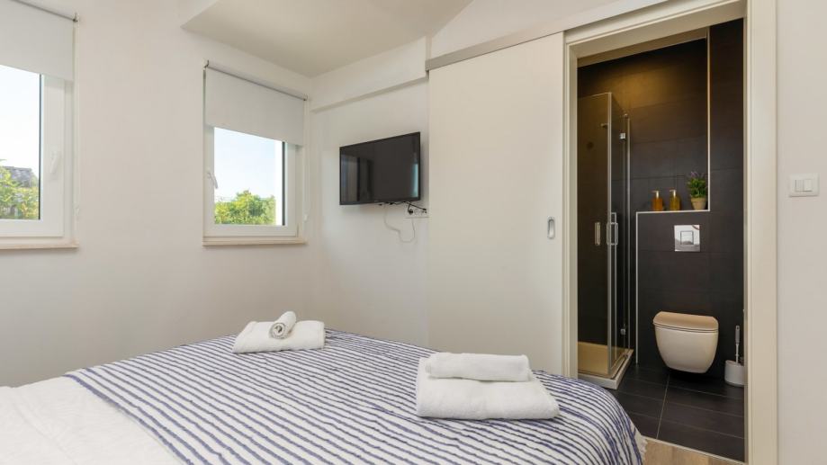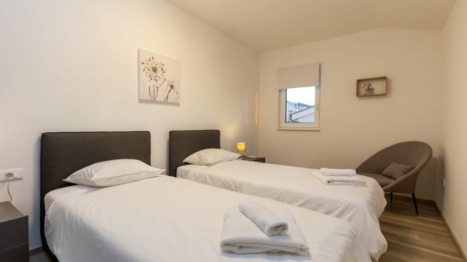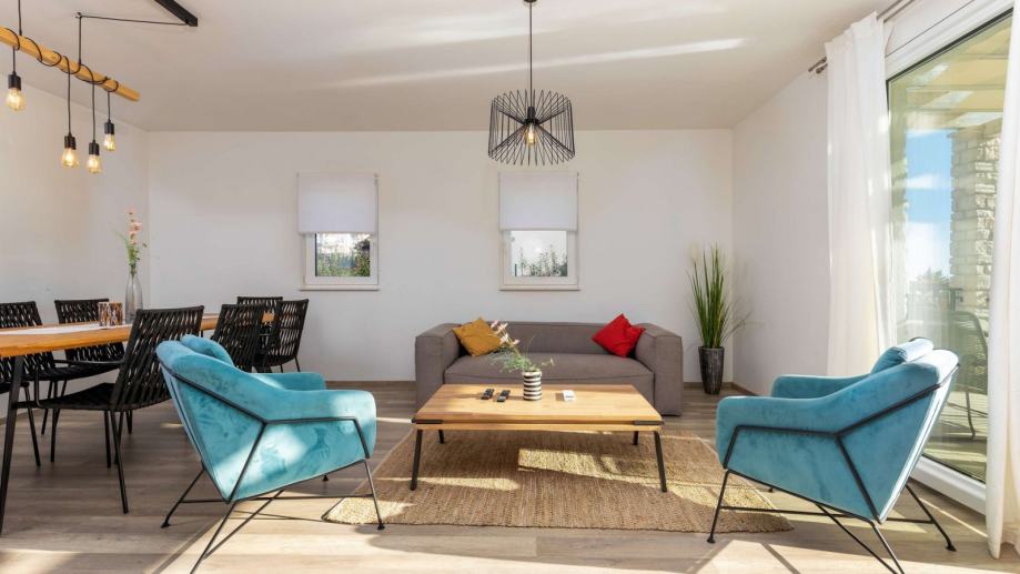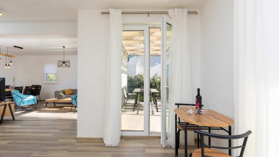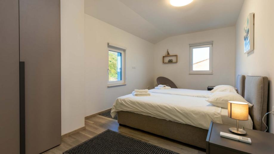 U prizemlju se nalazi prostrani dnevni boravak s kuhinjom i blagovaonicom, gostinjski toalet, spavaća soba s vlastitom kupaonicom te izlaz na terasu. Na katu su smještene tri spavaće sobe i dvije kupaonice, što pruža dovoljno prostora za obitelj ili goste.