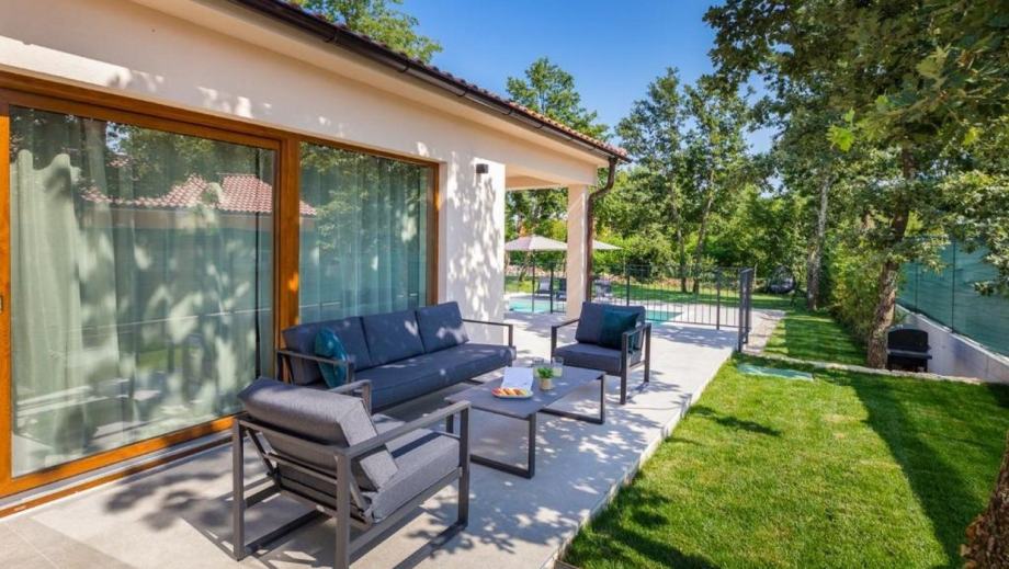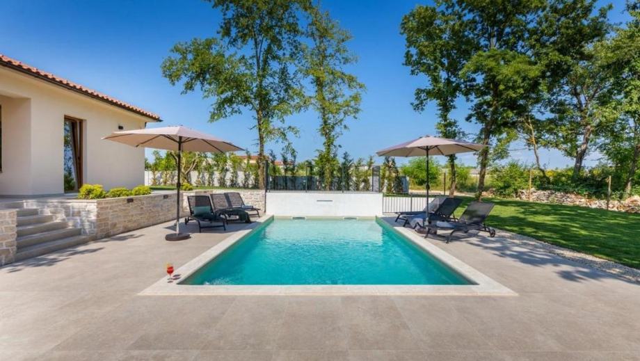 Smještena je na uređenoj okućnici površine 1000 m², na kojoj se nalaze bazen, travnjak s automatskim navodnjavanjem te parkiralište za četiri automobila.