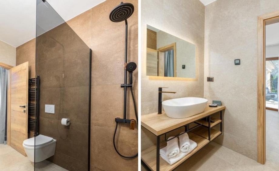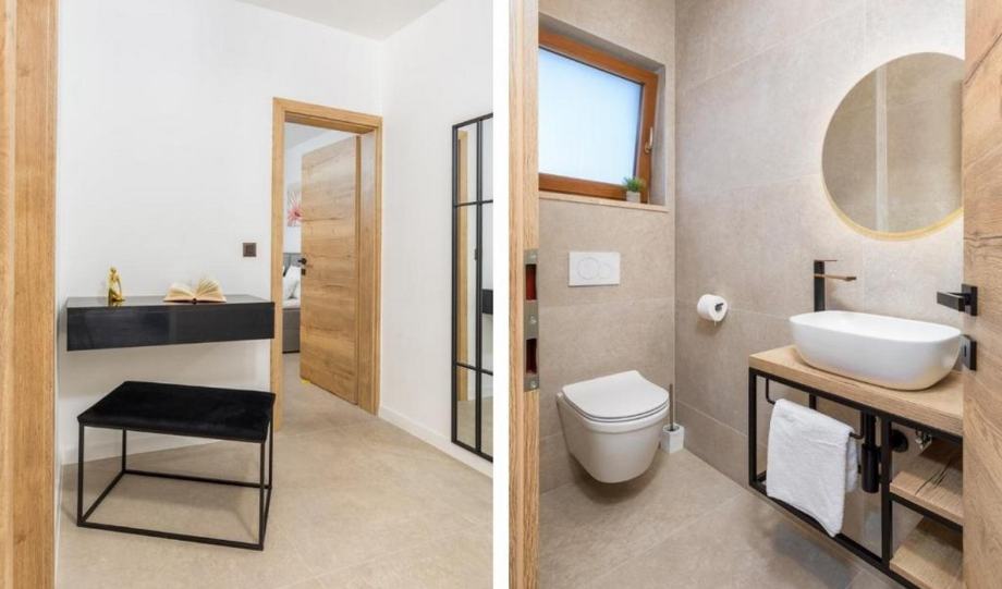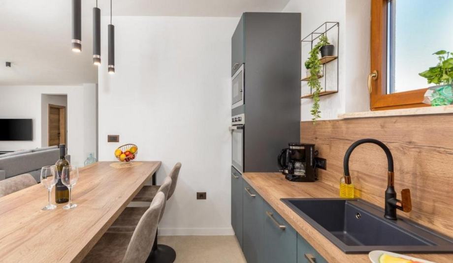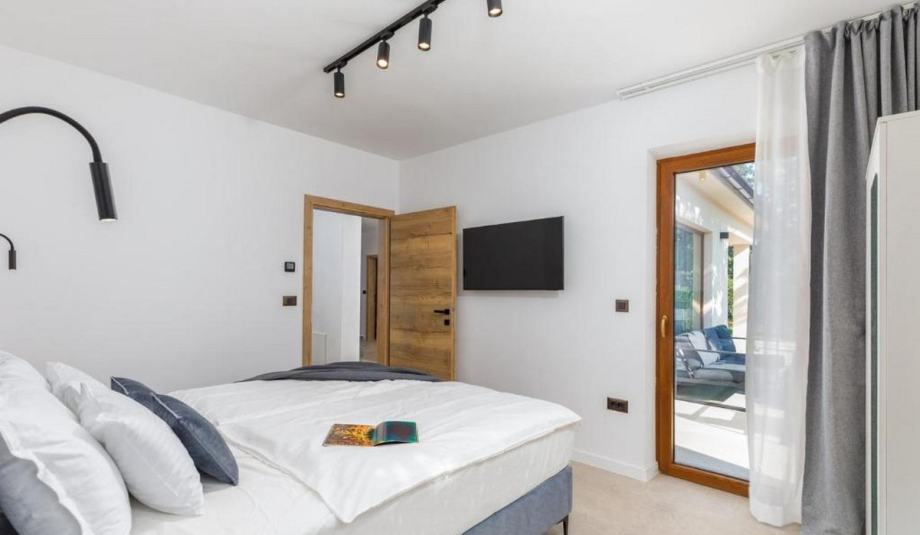 Kuća je opremljena podnim grijanjem, visokokvalitetnom PVC stolarijom u boji drva, protuprovalnim vratima te video nadzorom.
