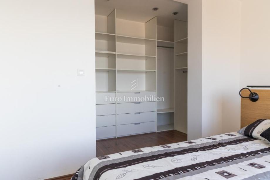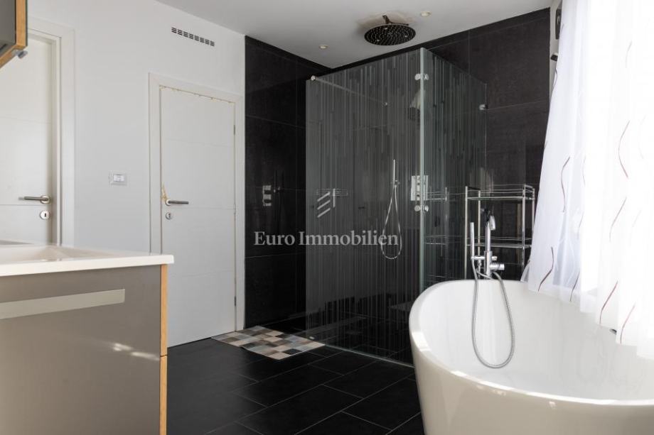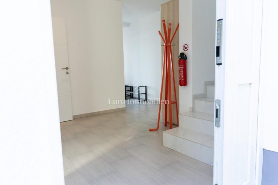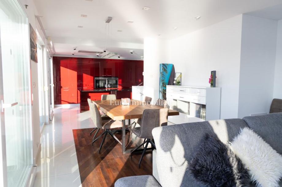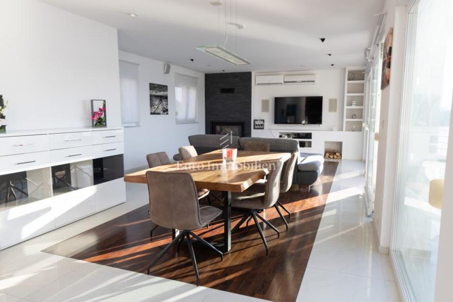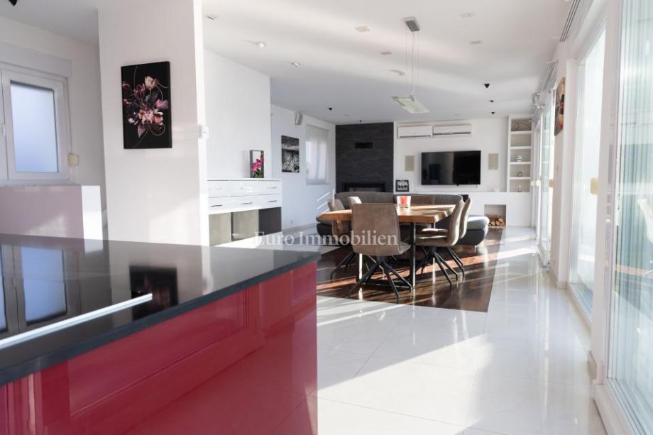 Unutarnje stepenice vode na kat, ukupne korisne površine 109,83 m², gdje se nalazi prostrani otvoreni prostor dnevnog boravka, kuhinje i blagovaonice, iz kojeg se izlazi na terasu veličine 50,33 m².