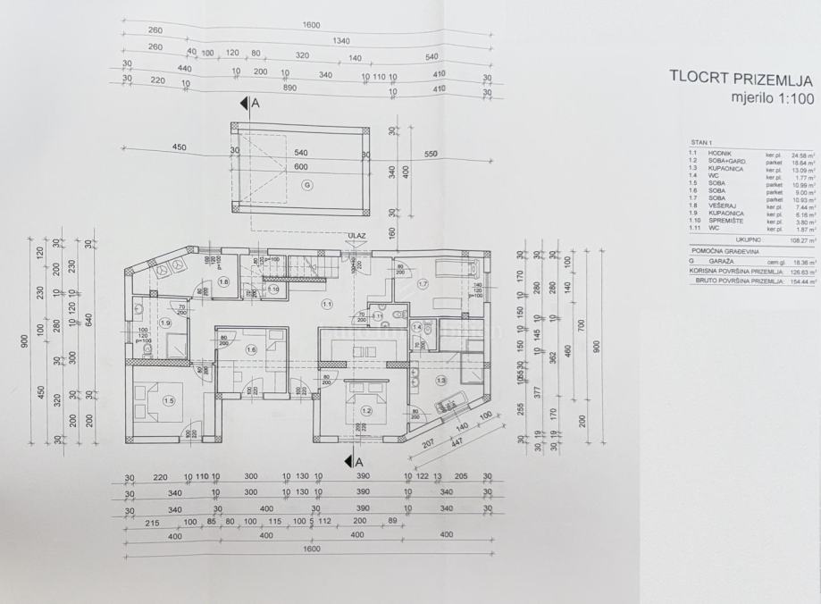 Kuća je izgrađena na parceli od 766 m² i sastoji se od dvije etaže. Prizemlje ima 154,44 m² bruto površine, uključujući garažu (18 m²), a na njemu se nalazi glavni ulaz u kuću. Prizemlje čine četiri spavaće sobe, od kojih jedna ima garderobu, vlastitu kupaonicu s tušem, kadom i toaletom te posebnu prostoriju namijenjenu wellnessu. U prizemlju se nalaze i dodatna kupaonica s WC-om, gostinjski WC, ostava te vešeraj s tehničkom prostorijom.