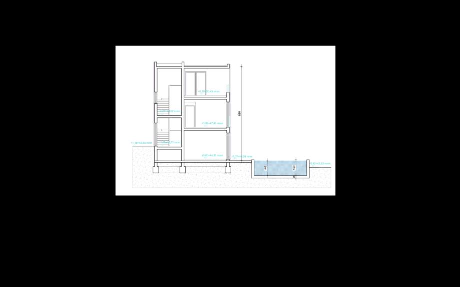 The ground floor will consist of: entrance area + staircase, two storage rooms, hallway, bathroom, kitchen with dining room and living room, uncovered terrace (pool deck), outdoor heated swimming pool and garden areas. Sea view.