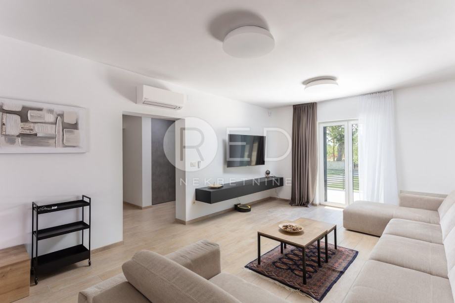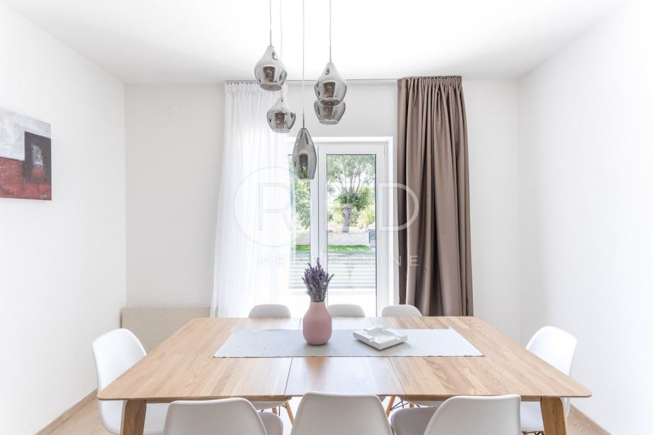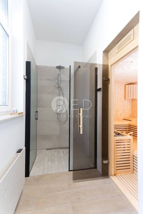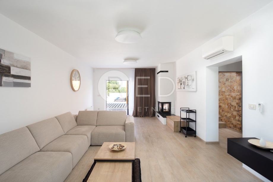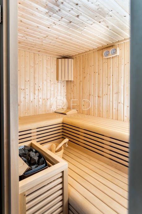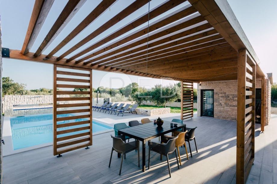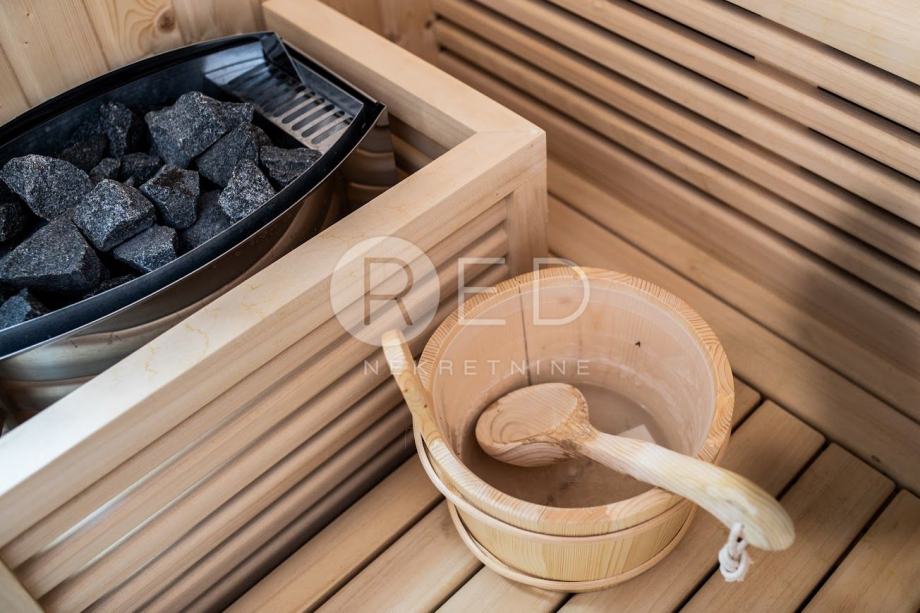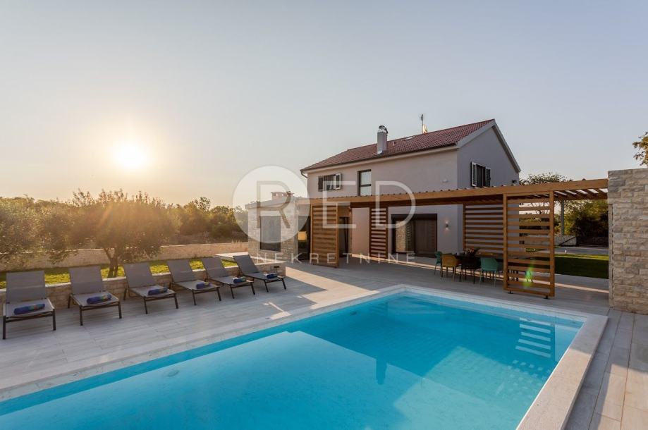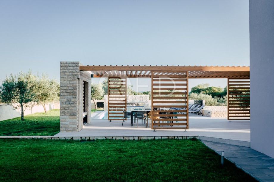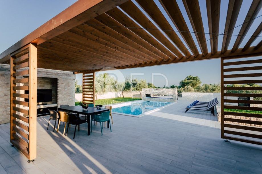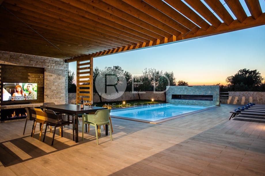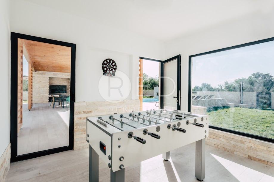 Grijanog vanjskog bazena dimenzija 8 × 4 m okruženim lounge garniturom za sjedenje, šest ležaljki i dvjema prostranim terasama. Vanjski blagovaonski stol za 8 osoba idealan je za obroke na svježem zraku, uz roštilj i TV na otvorenom, a dodatnu praktičnost pruža vanjski tuš. Za zabavu je tu zasebna soba za igranje s pikadom i stolnim nogometom. Posjed upotpunjuje maslinik površine te uređena okućnica od približno 1.000 m², što jamči mir i privatnost.