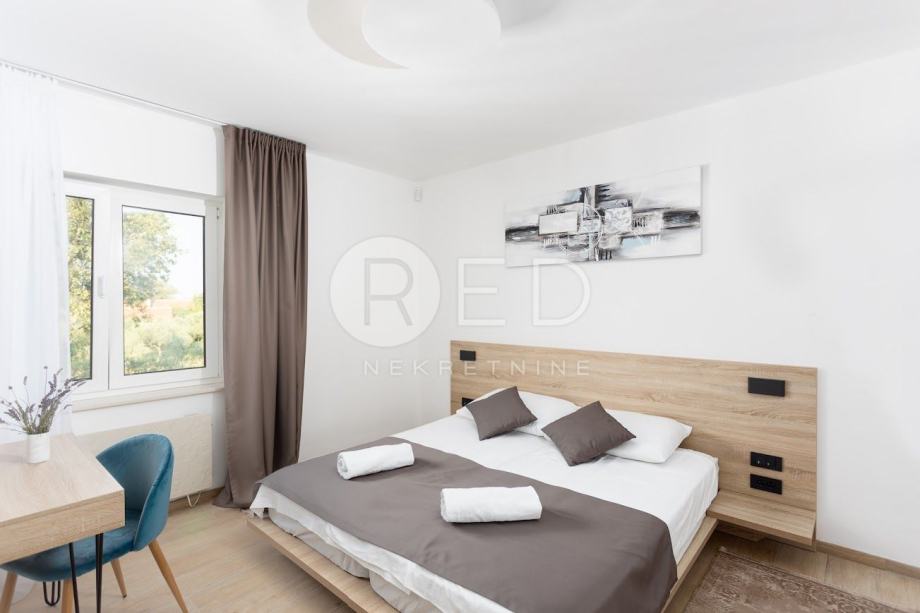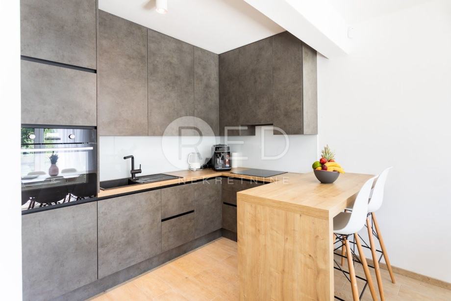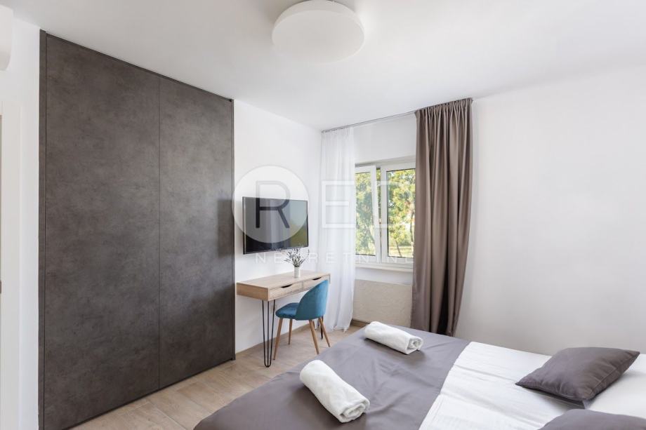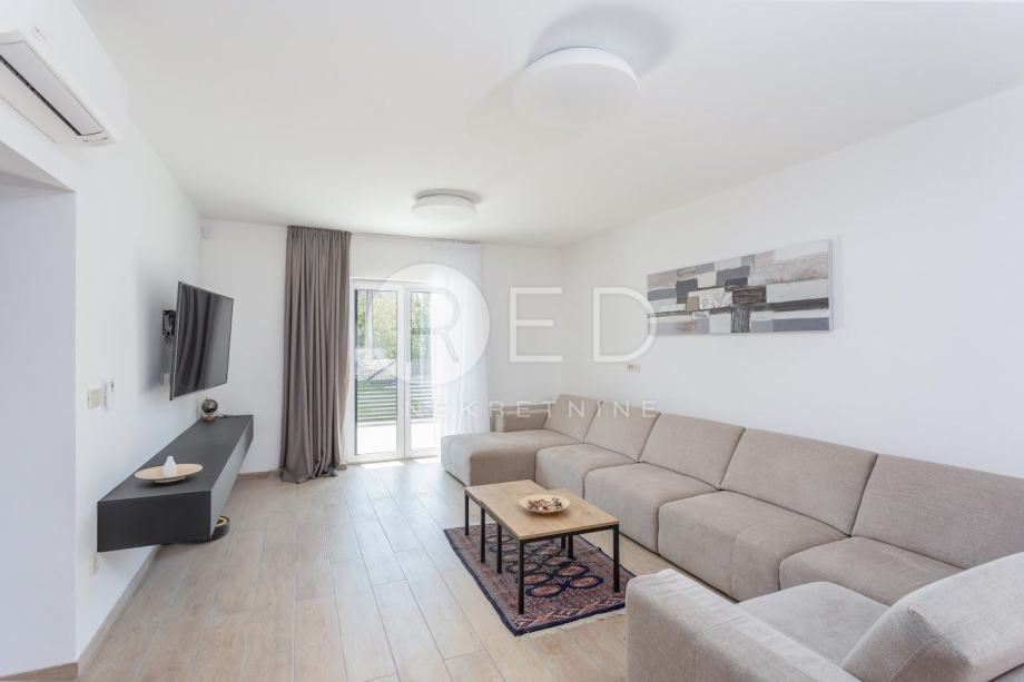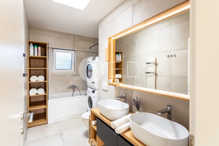 Četiri luksuzne spavaće sobe, svaka s televizorom, te prostranog dnevnog boravka s kutnom garniturom i kaminom. Na raspolaganju su četiri kupaonice i sauna. Dodatna oprema uključuje klima-uređaj, IPTV i kabelsku televiziju, perilicu i sušilicu rublja te sušilo za kosu. U blagovaonici je stol za 8 osoba, a kuhinja je potpuno opremljena: aparat za kavu, hladnjak sa zamrzivačem, hladnjak za vino, toster, perilica posuđa i mikrovalna pećnica.
