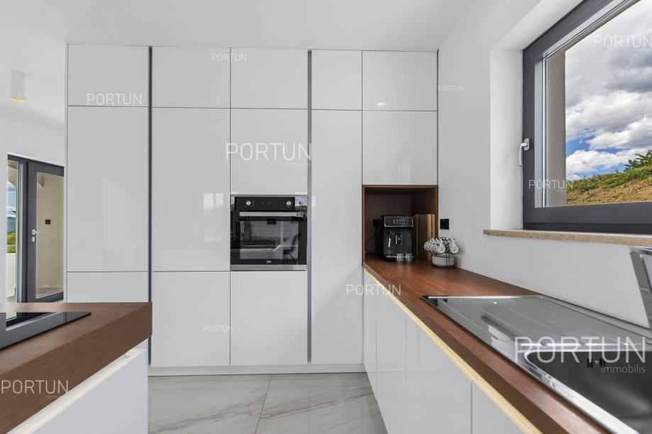 Nalazeći se na impresivnoj lokaciji u srcu Istre, između Motovuna i Buzeta, ova nova vila s tri spavaće sobe i tri kupaonice pruža očaravajući pogled na šume i zelene brežuljke. S velikim zemljištem od gotovo 3,500 m2, koje je uređeno u minimalističkom stilu zahtijevajući vrlo malo održavanja, ova vila nudi miran i elegantan životni prostor. Raspoređena na dvije razine, prizemlje i prvi kat, vila nudi prostrani dnevni boravak s kuhinjom i blagovaonicom, jednu spavaću sobu i kupaonicu na prizemlju. Dnevni boravak odiše suvremenim minimalizmom, s naglaskom na velike prozore i balkonska vrata koja pružaju prekrasan pogled. Na južnom dijelu prizemlja nalazi se teretana s fantastičnim pogledom na zeleni krajolik. Elegantno bijelo stubište vodi na prvi kat, gdje se nalaze još dvije spavaće sobe, svaka s vlastitom kupaonicom. Prednji prostor vile zauzima prostrana terasa opremljena ležaljkama i solarnim tušem, uz rub terase smješten je preljevni bazen s hidromasažnom klupom. U dvorištu se također nalazi terasa s hidromasažnom kadom, vanjska blagovaonica pod tendom te terasa s dječjim igralištem, pružajući raznolike mogućnosti za opuštanje i zabavu. Jedna od ključnih prednosti života na ovoj lokaciji je bogata gastronomska ponuda, poznata po lokalnim tartufima, kao i blizina termalnog lječilišta Istarke toplice i brojnih pješačkih i biciklističkih staza. Boravak u ovoj vili pruža nezaboravno iskustvo zahvaljujući mesmerizirajućem pogledu na zelene brežuljke, čineći je idealnim izborom za kupce koji cijene vrhunsku lokaciju bez kompromisa. KLJUČNE OSOBINE✔ Panoramska lokacija nedaleko od Motovuna✔ 3 Spavaće sobe | 3 Kupaonice✔ Bazen | 60,00 m2✔ Zemljište 3.385 četvornih metara✔ Kategorizacija: 4 Zvjezdice. ✔ Podno grijanje i hlađenje na dizalicu topline