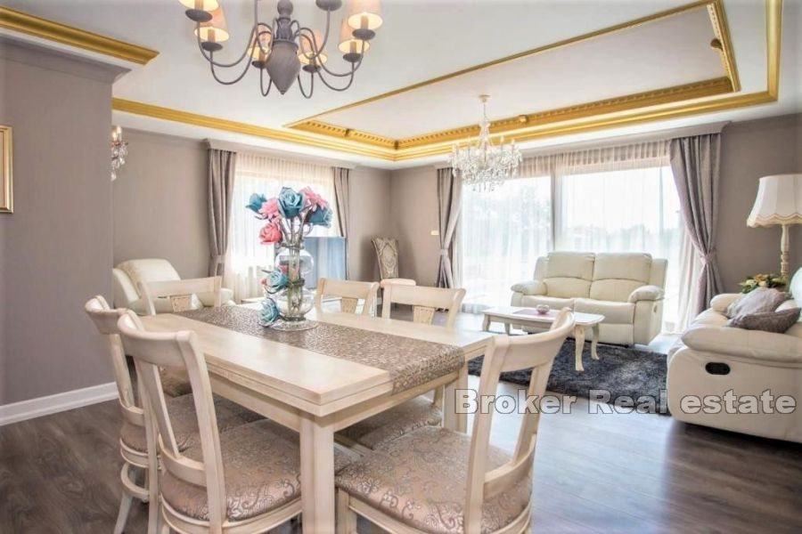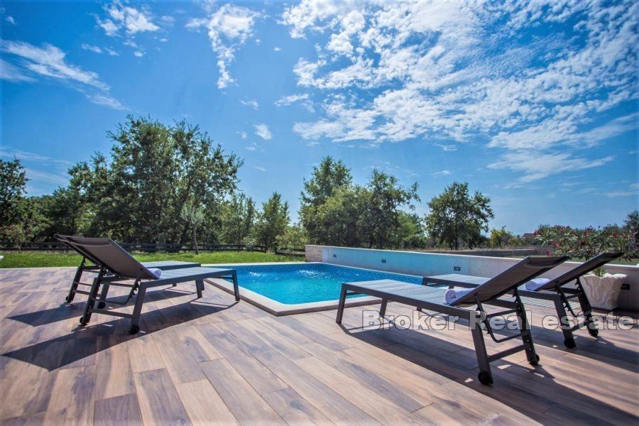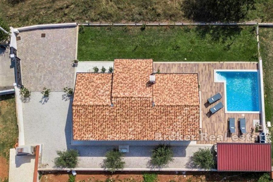 Dnevni boravak ima izlaz na terasu koja se sastoji od bazena sa sunčalištem i natkrivenim prostorom za druženje s roštiljem.