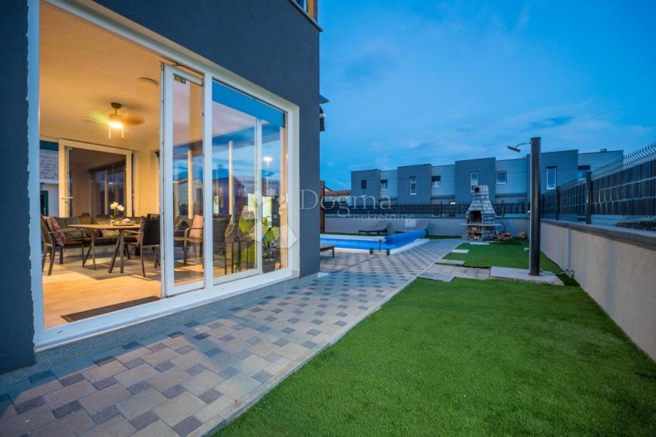 Na dvorištu nekretnine nalazi se prostrano sunčalište, idealno za izležavanje i uživanje u suncu. Dodatno, tu je ljetni pomoćni objekt koji se može koristiti kao prostor za odlaganje ili kao mjesto za druženje. Najveća atrakcija vanjskog prostora je veliki grijani bazen, koji je savršen za zabavu i druženja tijekom cijele godine, neovisno o sezoni.