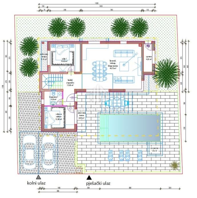 Bazen dimenzija 8 x 3,5 m s jacuzzijem, sunčalištem i vanjskim tušem