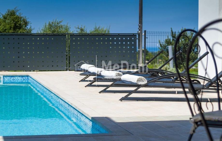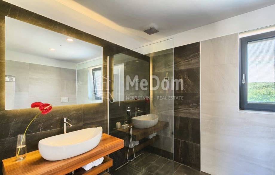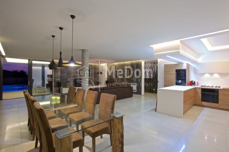 Agencija MeDom posreduje u prodaji prekrasne luksuzne vile na zapadnoj obali Istre, Višnjanu, u okolici Poreča. Vila ima stambenu površinu od 370m2. U prizemlju se nalazi dizajnerski uređen dnevni boravak sa blagovaonicom i kuhinjom, jednom spavaćom sobom, kupaonicom i toaletom. Iz dnevnog boravka izlazi se na lijepo uređenu terasu i bazen. Na terasi se nalazi i vanjski kamin sa uređenim mjestom za druženje. Na prvom katu vile nalaze se tri spavaće sobe i dvije kupaonice. Sobe imaju izlaz na veliki zajednički balkon sa kojeg se pruža prekrasan pogled na okolni krajolik i na more. Dvije spavaće sobe imaju integrirani prostor za garderobu. U rustikalno uređenom podrumu se nalazi još jedna kuhinja sa kaminom i velikim blagovaonskim stolom, biljarskim stolom, kupaonicom i spavaćom sobom. Vila ima i jacuzzi i saunu. U izgradnji vile korišteni visoko kvalitetni materijali. Vila ima podno grijanje, klimatizirana je, ima alarm, videonadzor, rolete na struju i navodnjavanje zelenih površina. Vila se prodaje kompletno namještena i opremljena. Vila ima odlično uhodan posao za turistički najam i interesantna je i kao investicija i kao kuća za luksuzan obiteljski život. U blizini vile nalaze se svi potrebni sadržaji za život i razonodu. Višnjan je slikovit i živopisan istarski gradić sa prekrasnom starogradskom jezgrom. Općina Višnjan ima u svojem sastavu niz manjih mjesta u kojima se nude razni turističko-smještajni kapaciteti i nadaleko čuveni gastronomski specijaliteti. Uz netaknutu prirodu i savršen mir, osjećaj spokoja je neopisiv. Šarm Višnjana te njegova duga povijest mogu se osjetiti na svakom koraku te predstavljaju savršenu kulisu za uživanje u kulturnim događajima poput mjesnih fešta, sajmova, glazbenih koncerata, filmskih projekcija. U svojim ljetnim bogatim kulturno-glazbenim programima na najljepšoj pozornici starogradske jezgre svatko može naći nešto za sebe. Udaljenost od vile do prvih prirodnih morskih plaža je svega 10 minuta vožnje a do autoceste samo tri minute vožnje. Kupac ne plaća agencijsku proviziju!