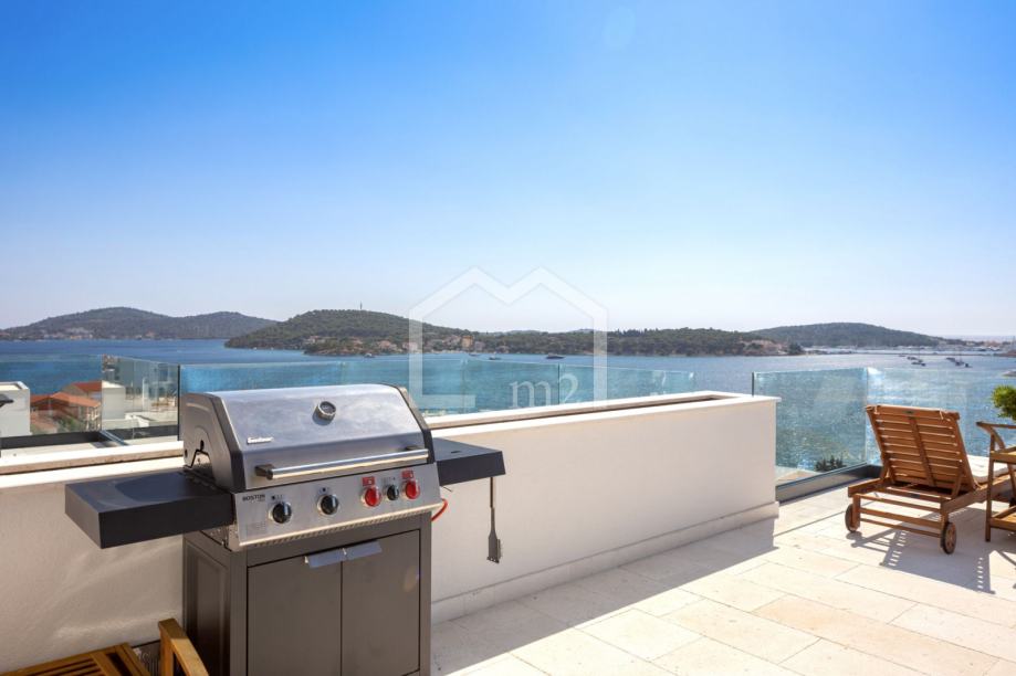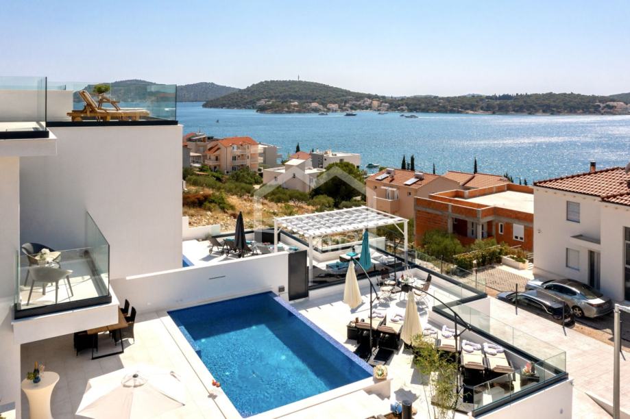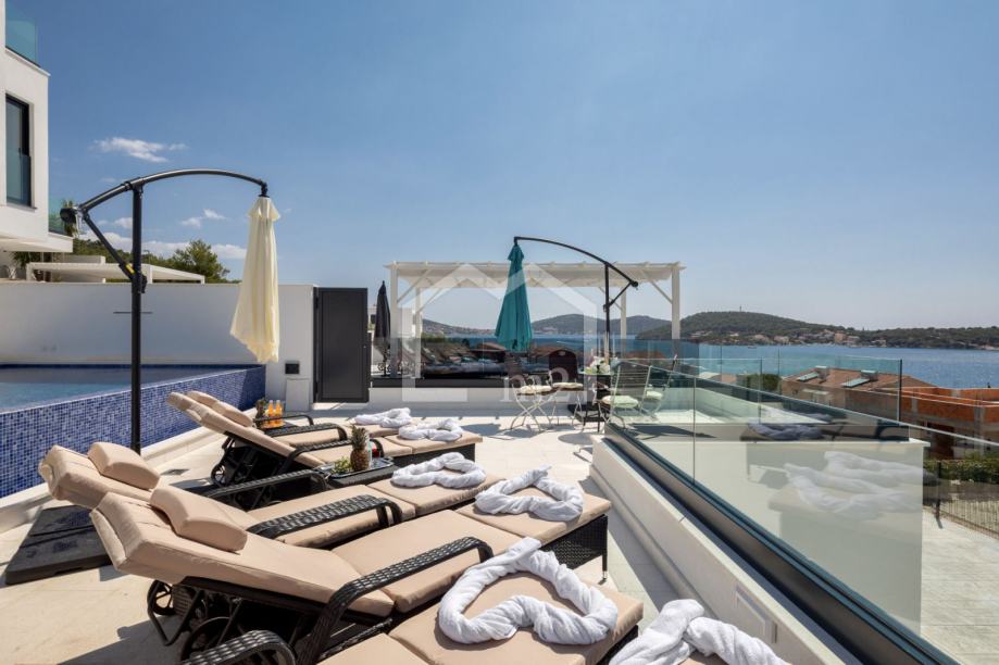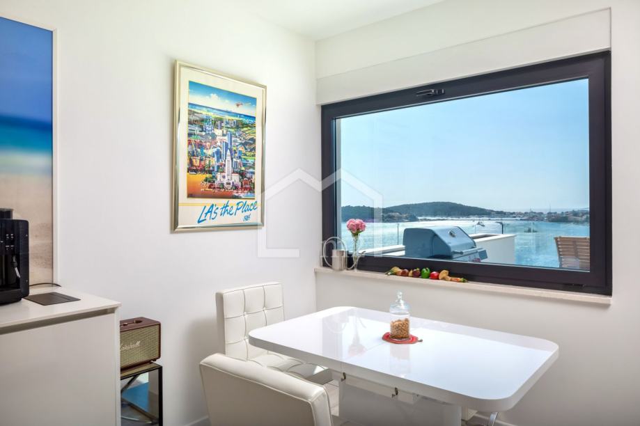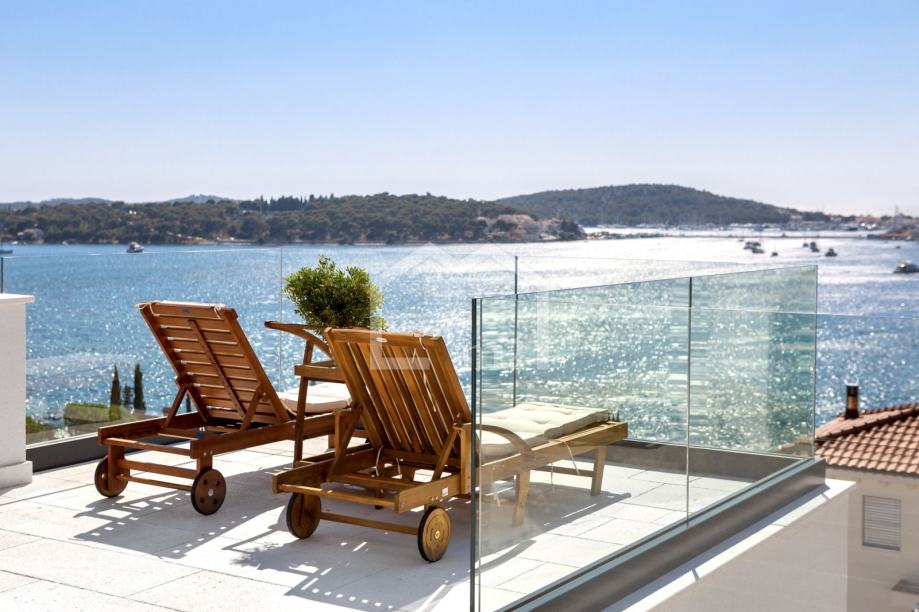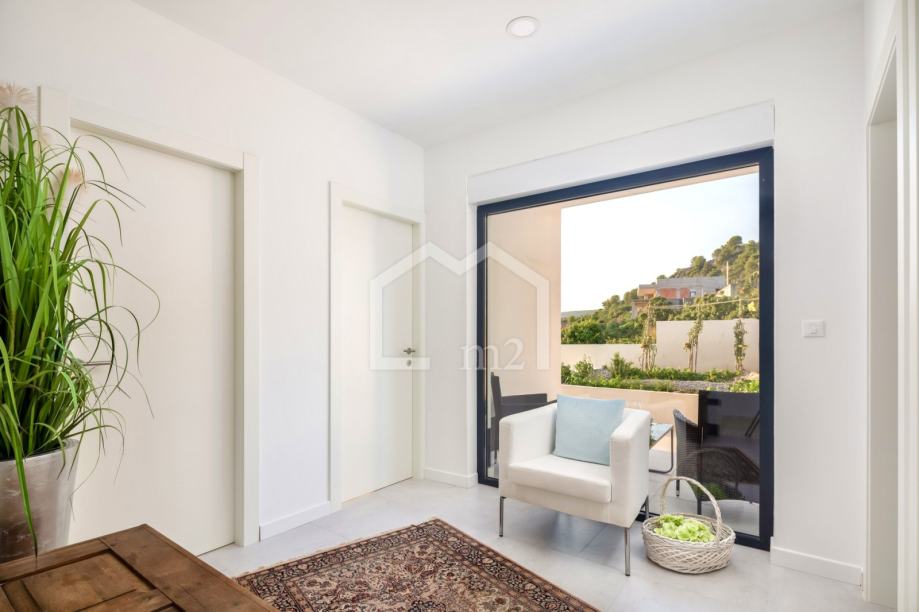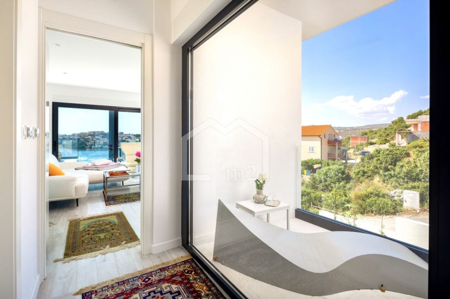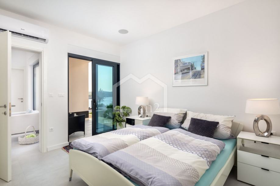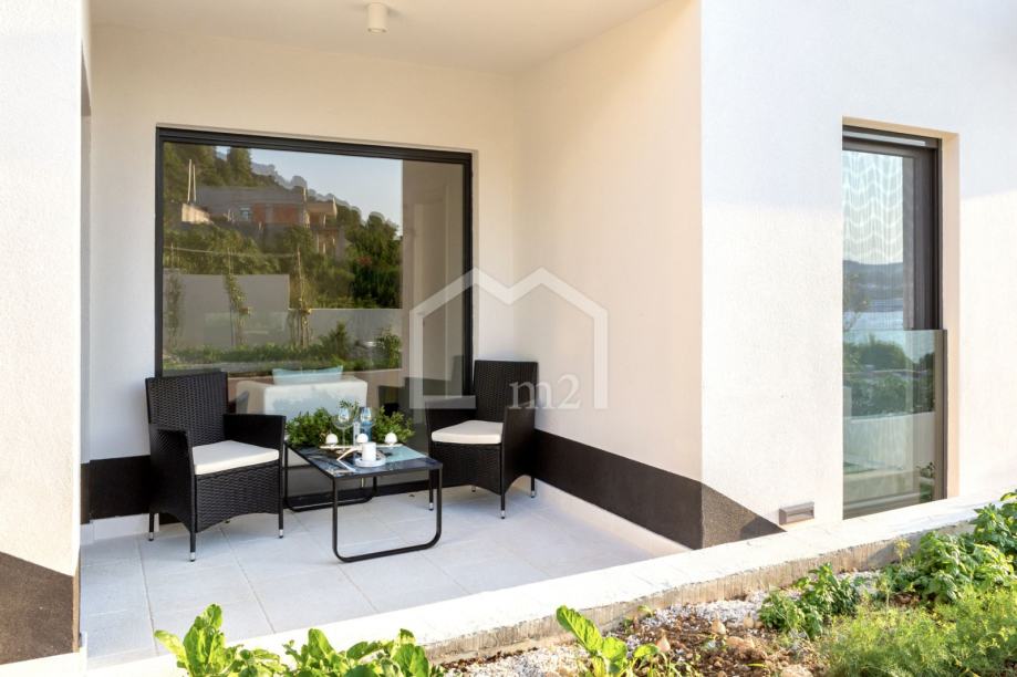 U prizemlju su smještene tri spavaće sobe sa kupaonama, dvije manje terase. Sa svake terase se pruža odličan pogled na more i Rogoznicu.