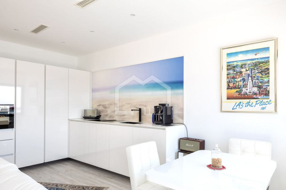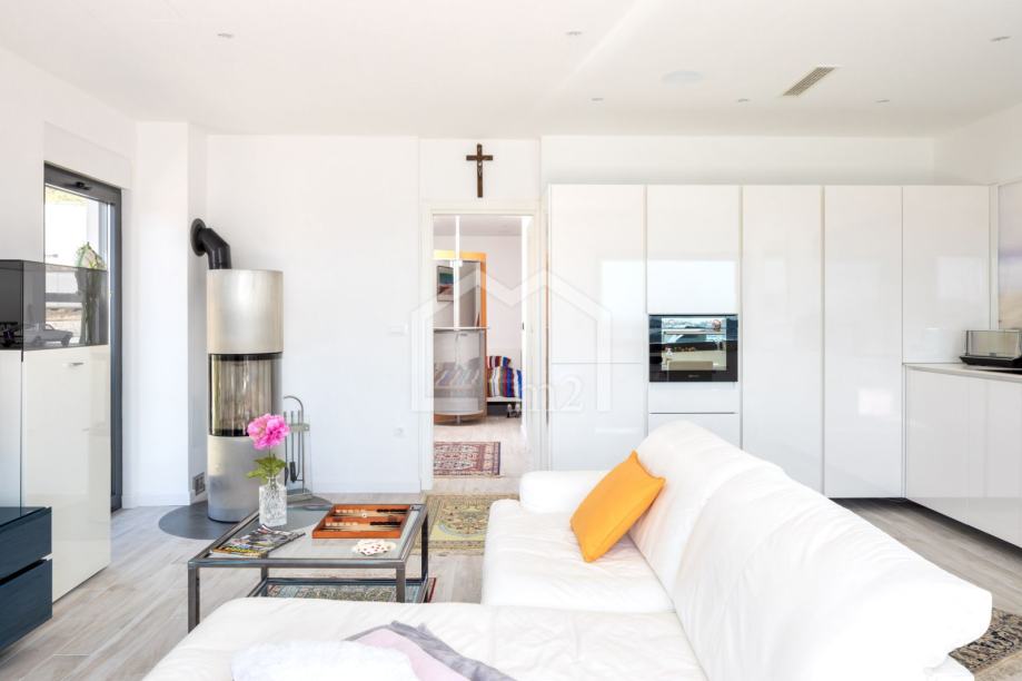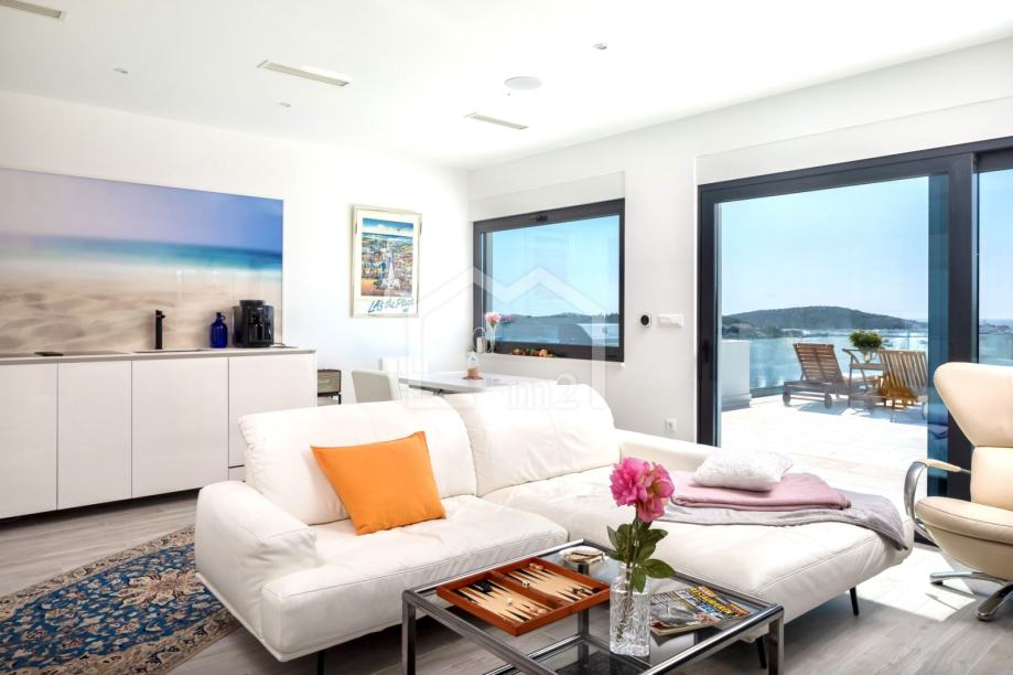 Na prvom katu se nalazi veliki dnevni boravak s kuhinjom i blagovaonicom, kupaonica, spremište te spavaća soba sa prostranom terasom.