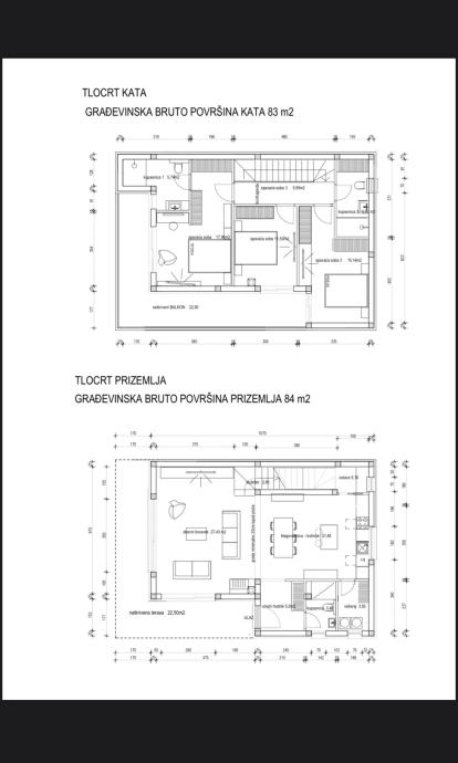 Na katu se nalaze tri udobne spavaće sobe, dvije kupaonice i dodatna terasa.
