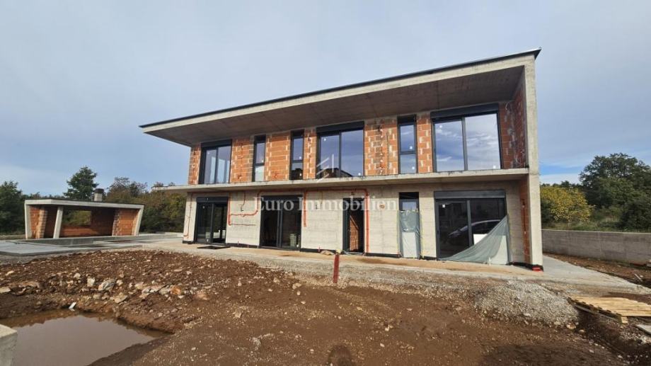 Prodaje se atraktivna villa modernog dizajna s bazenom i većom okućnicom, na mirnoj lokaciji otprilike 10 minuta vožnje do mora i centra grada Poreča. Gradi se na zemljištu od 1.080 m2. Unutar ograđenog dvorišta villa će imati bazen veličine 36,30 m2 i ljetnu kuhinju od 23,88 m2 koja je povezana sa vanjskim spremištem od 4,91 m2. Ova moderna villa ima neto stambenu površinu od 179,61 m2, a koncipirana je na dvije etaže: prizemlje i kat. Glavni ulaz je na južnom pročelju gdje se preko natkrivenog prolaza ulazi u hodnik koji povezuje spavaću sobu s kupaonicom, toalet za goste, te vodi u otvoreni prostor koji se sastoji od kuhinje, blagovaonice i prostranog dnevnog boravka. Iz dnevnog dijela je izlaz na djelomično natkrivenu terasu. Unutarnjim stepenicama dolazi se na kat gdje su tri spavaće sobe s vlastitim kupaonicama i balkonima s kojih se pruža pogled na prirodu. Na raspolaganju su tri parkirna mjesta.