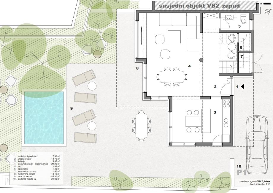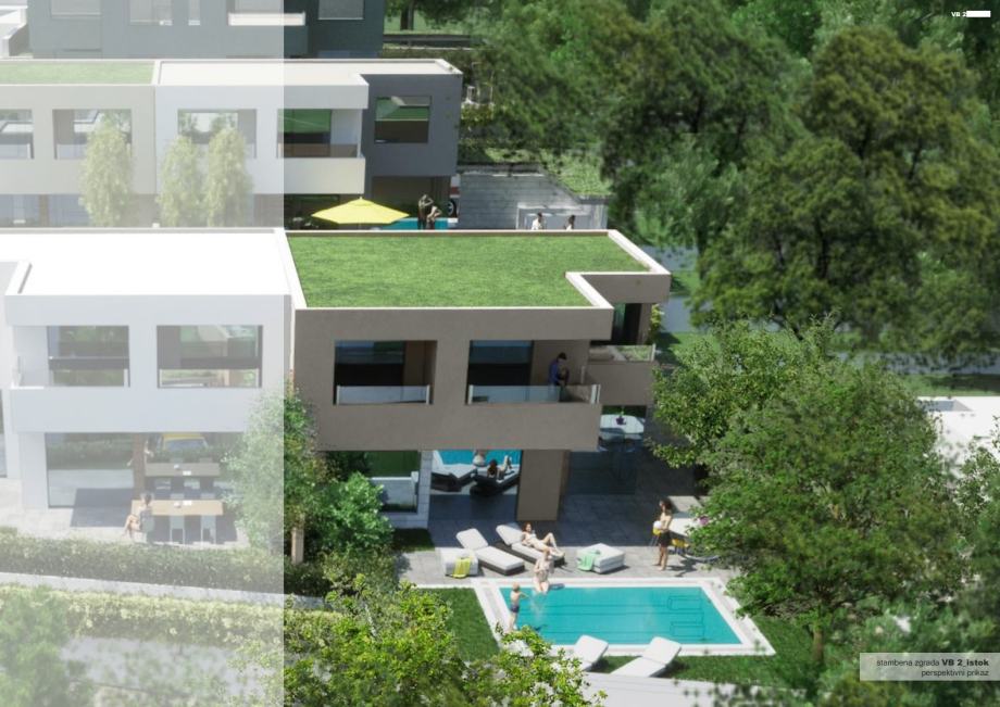 Villa se sastoji od prizemlja i prvog kata ukupne neto površine 163m2. U prizemlju je smješteno: ulazni prostor, kuhinja, prostrani dnevni boravak i blagovaonica, kupaonica, ostava, strojarnica bazena, natrivena terasa, vrt površine 186m2 s vanjskim bazenom i kamenim kaminom, na prvom katu su mještene tri spavaće sobe, dvije kupaonice, te tri lođe. Ispred vile je uređena okućnica u hortikulturalnom stilu s puno zelenila, te su predviđena dva vanjska parkirna mjesta.